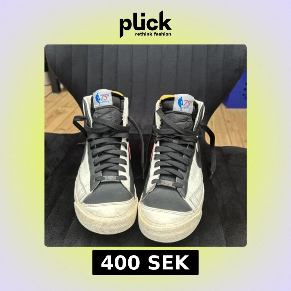 Nike Blazer Mid sneakers i specialutgåva för NBA:s 75-årsjubileum. Skorna har svart och vit ovandel i skinn med svarta och röda swooshes, svarta snören och detaljer i gult på plösen. Klassisk retrodesign med högt skaft och robust sula.