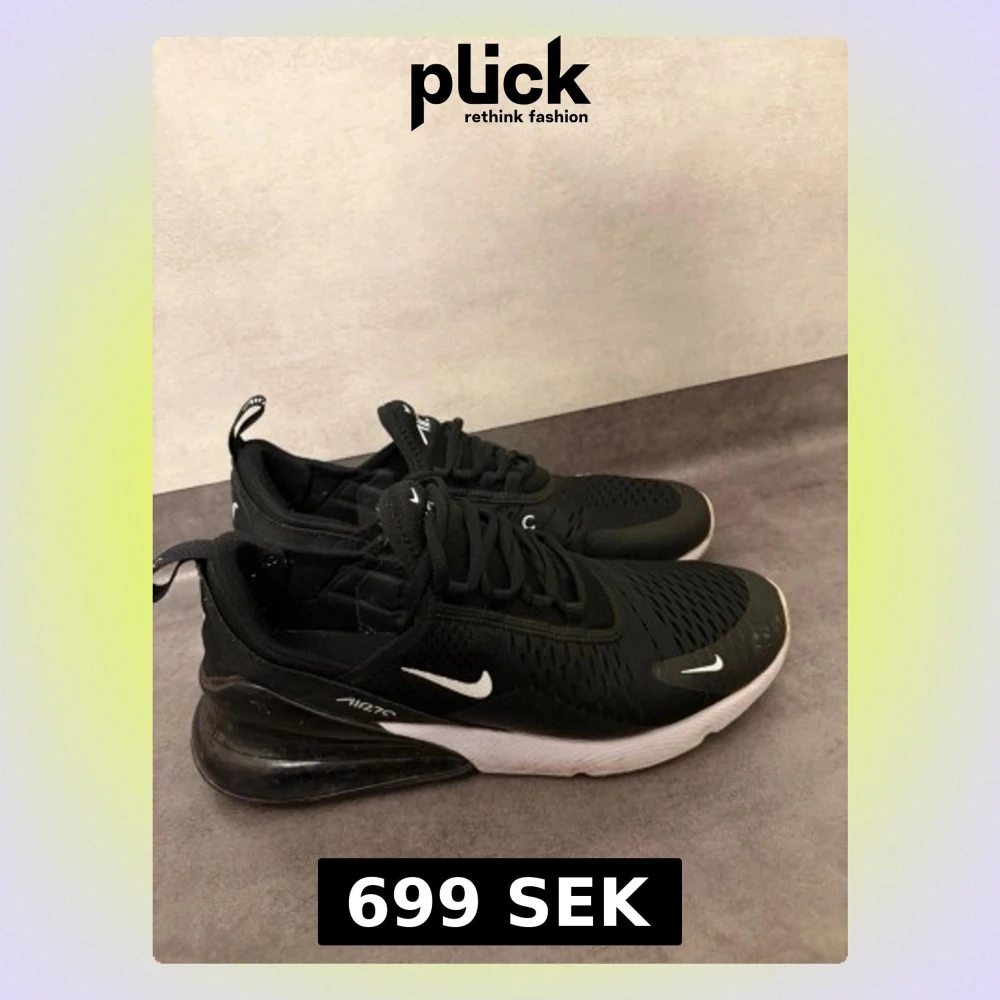 Svarta Nike Air Max 270 sneakers med vit sula och klassisk Nike-logga på sidan. Skorna har snörning, mesh-överdel för bra ventilation och en tydlig Air Max-bubbla i hälen. Perfekta för dig som gillar sportig och stilren look.