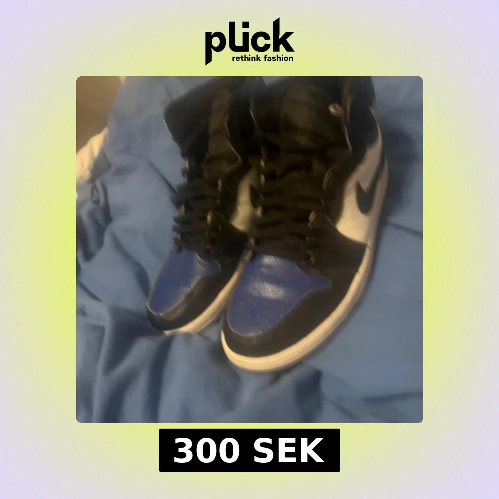 Snygga Nike Air Jordans i en klassisk färgkombination av svart, blå och vit. Skorna har en hög design med snörning och den ikoniska Nike-loggan på sidan. Perfekta för dig som vill ha en stilren och sportig look.
