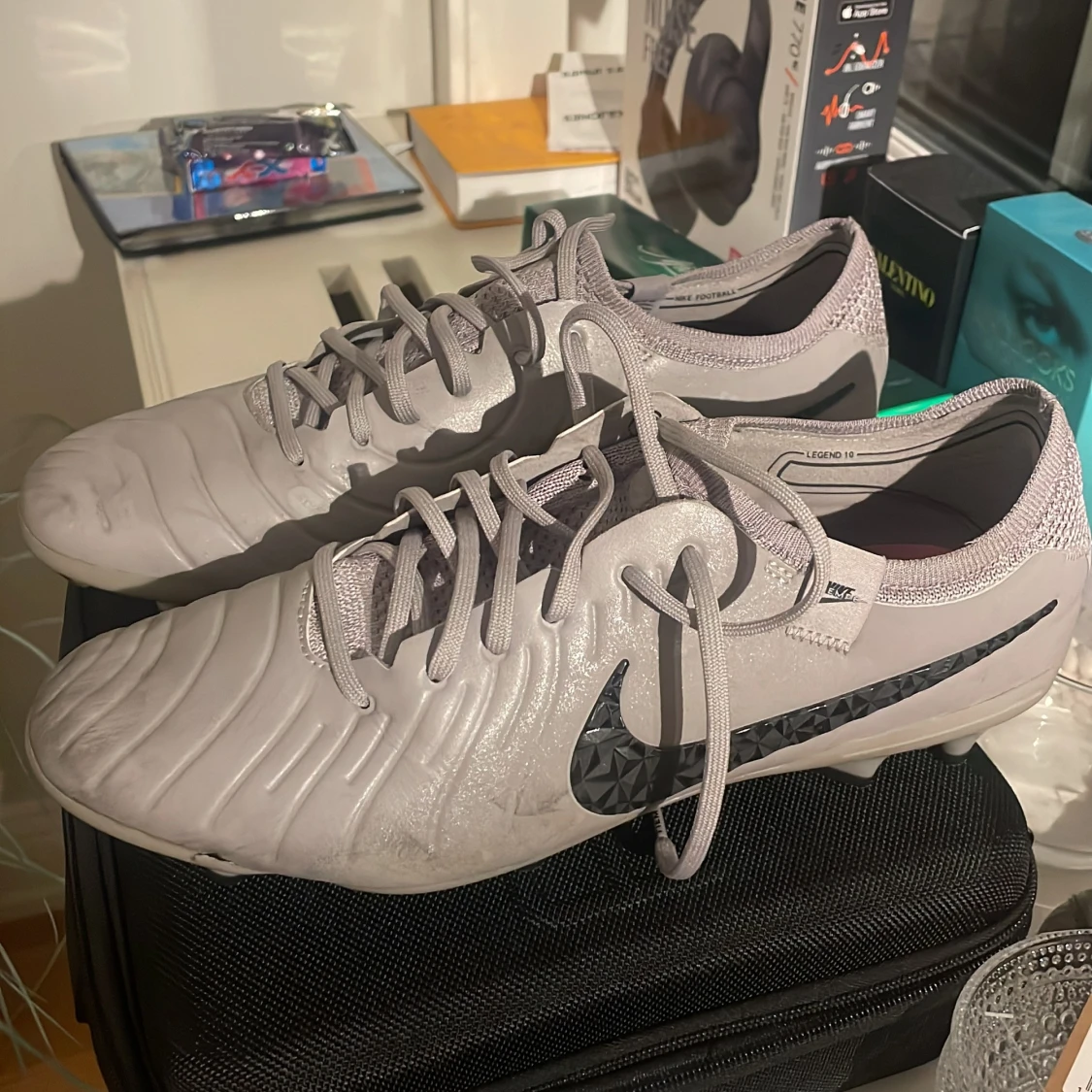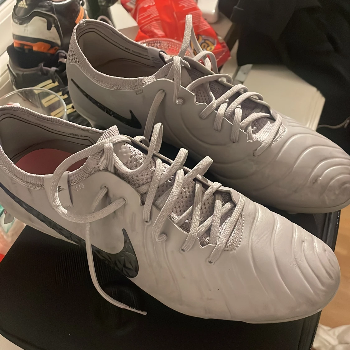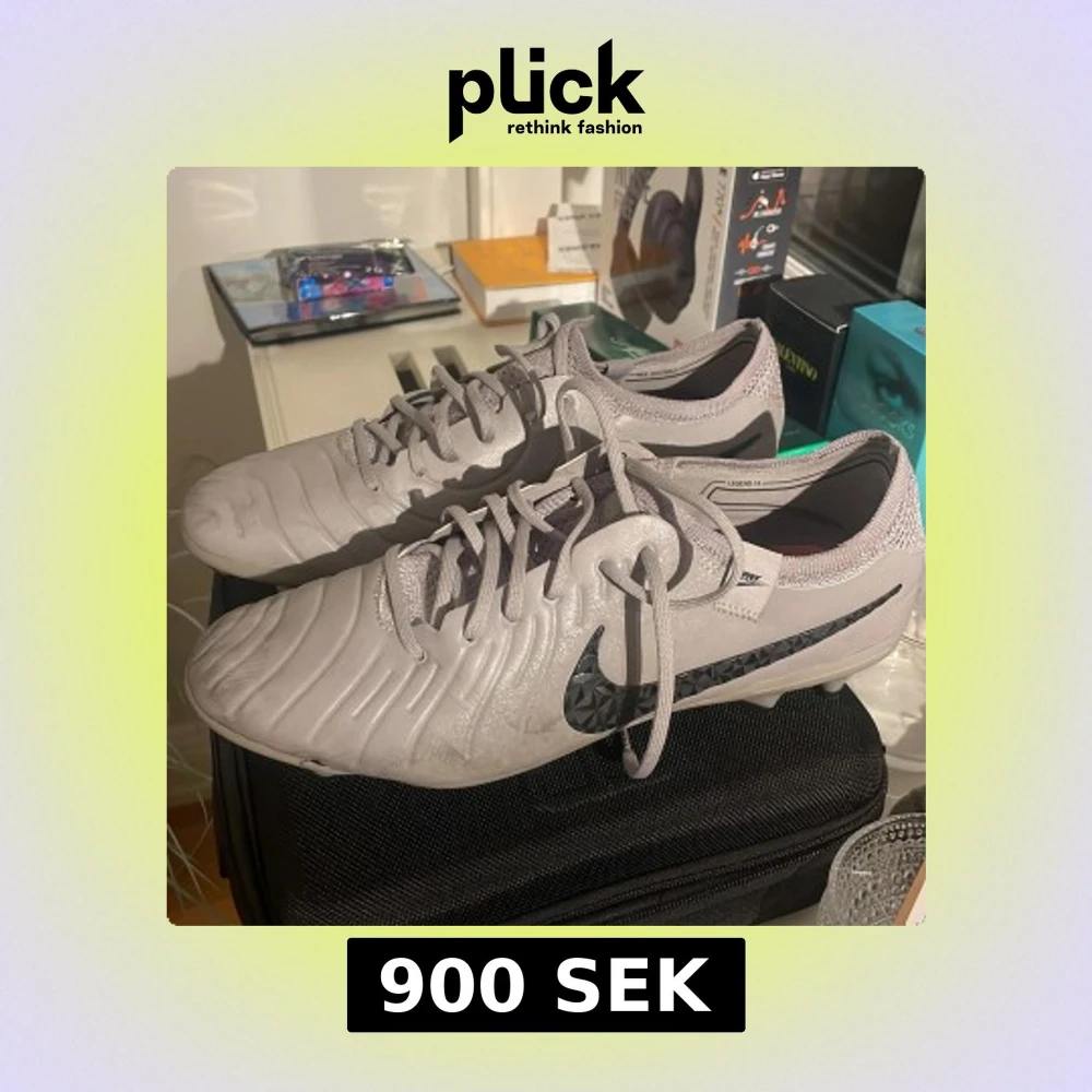 Snygga grå fotbollsskor från Nike med svart logotyp och snörning. Skorna har en modern design, som inte säljs längre på marknaden. Skick 8/10 lite använda men väldigt fina och framförallt hela. Perfekta för fotbollsträning och matcher.