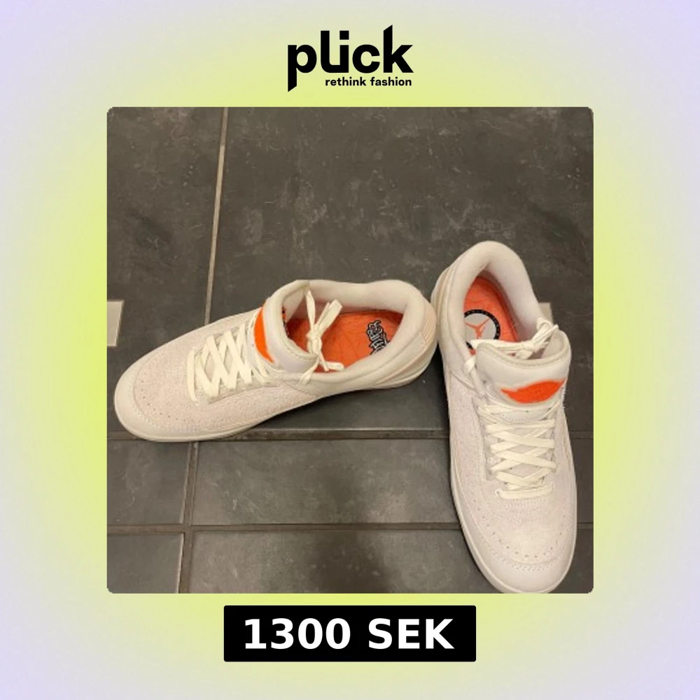 Nike Air Jordan 2 sneakers i vitt skinn och mocka med orange detaljer på plös och innersula. Kommer med extra skosnören i grönt och orange. Låg modell med klassisk Air Jordan-logga och cool text 'TEAM ONLY' på insidan av plösen.