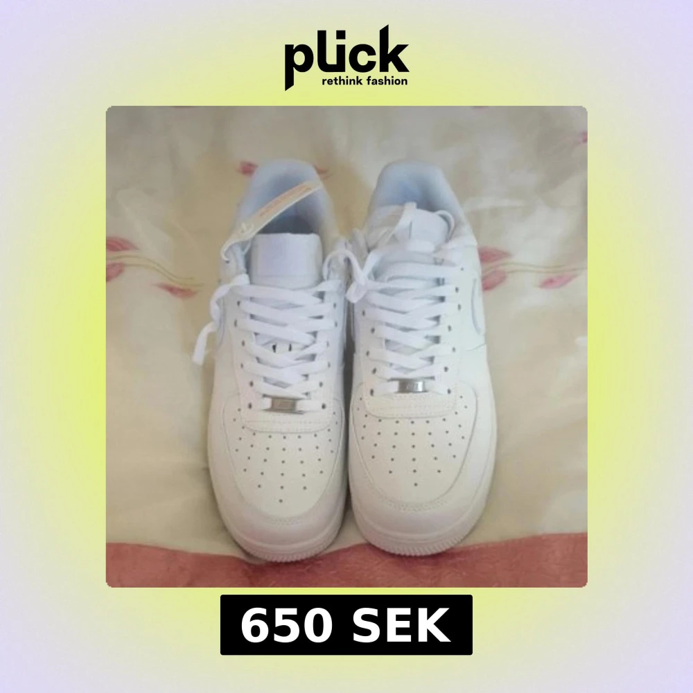 Klassiska Nike Air Force 1 sneakers i helvitt skinn med perforerad tå, vit sula och snörning. Swoosh-logga på sidan och metallbricka på snörningen. Perfekta för en clean och stilren look.