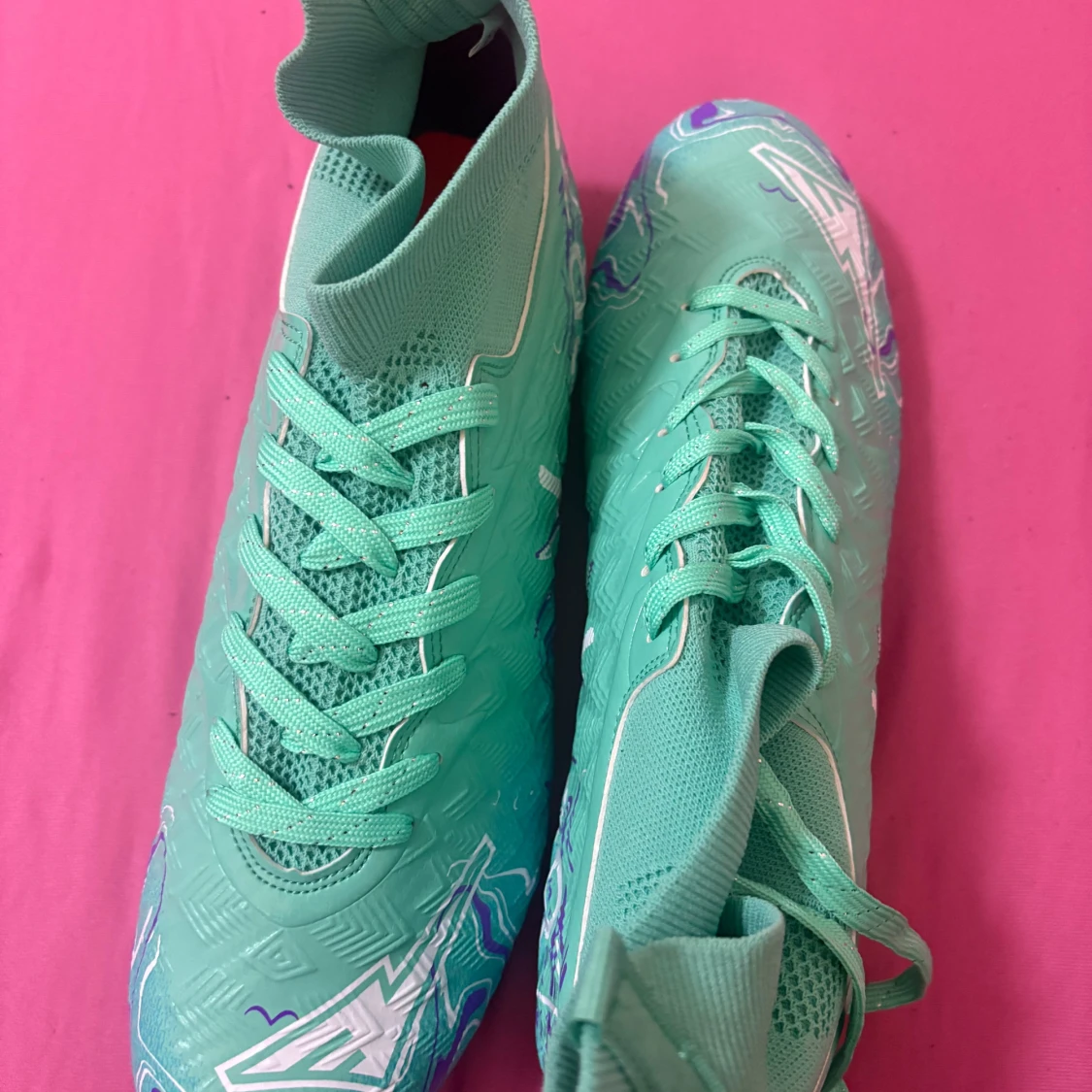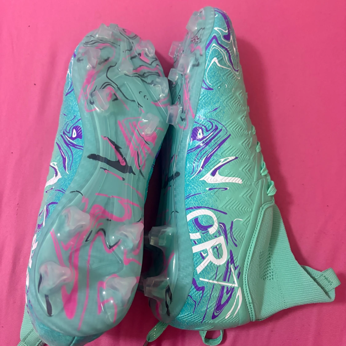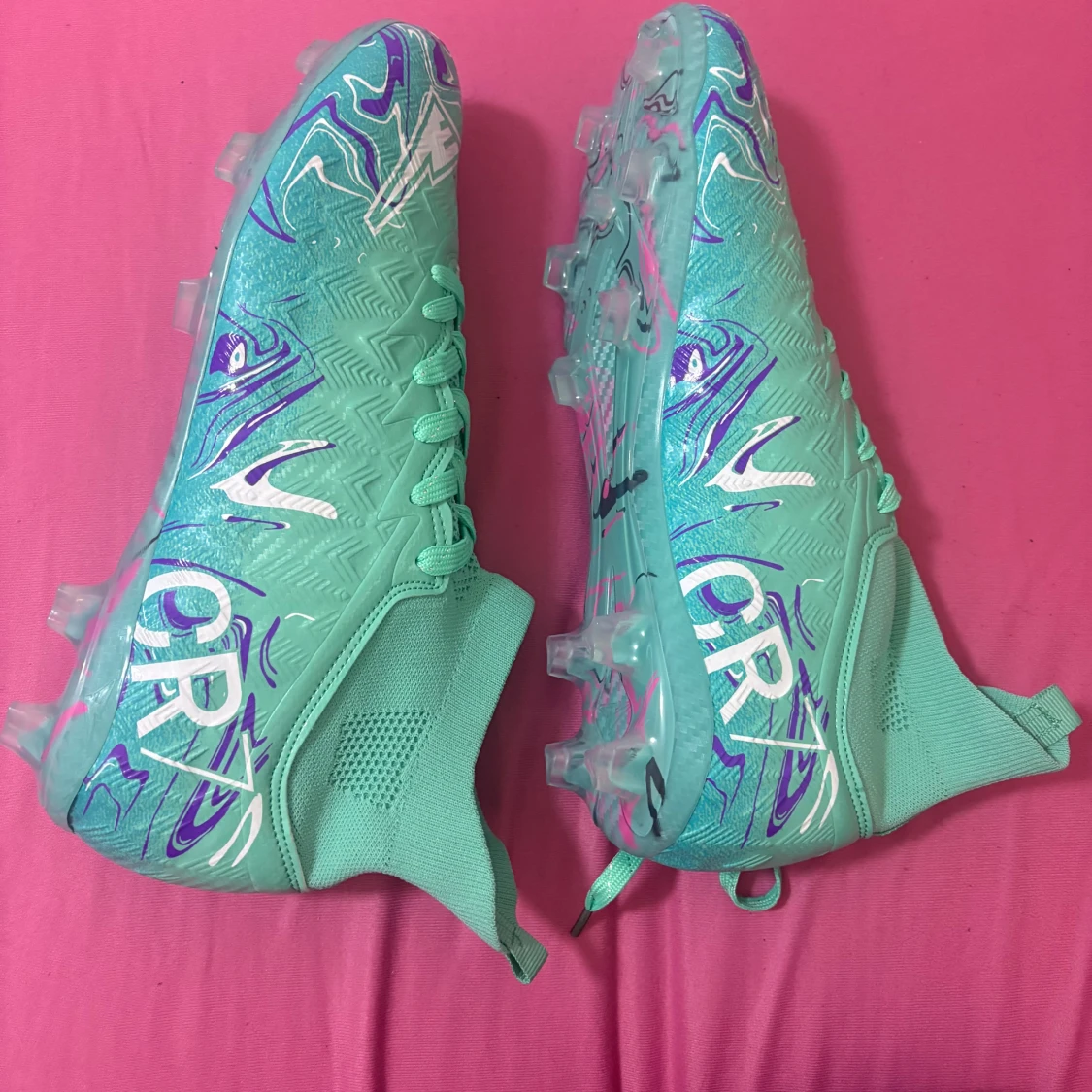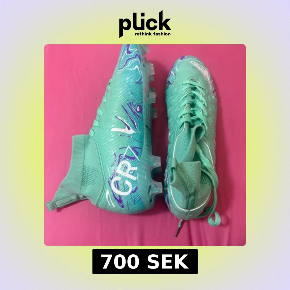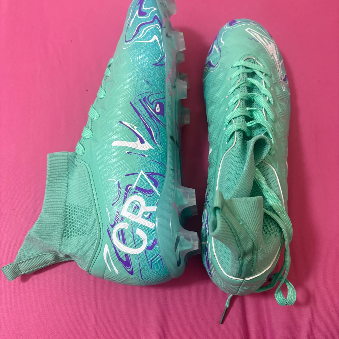 Säljer ett par mintgröna CR7 fotbollsskor med högt skaft och snörning. Skorna har ett coolt abstrakt mönster i lila, vitt och rosa samt CR7-logga på sidan. Ovandelen är i syntetmaterial med mesh vid ankeln för extra komfort. Sulan har dobbar för gräsplan.