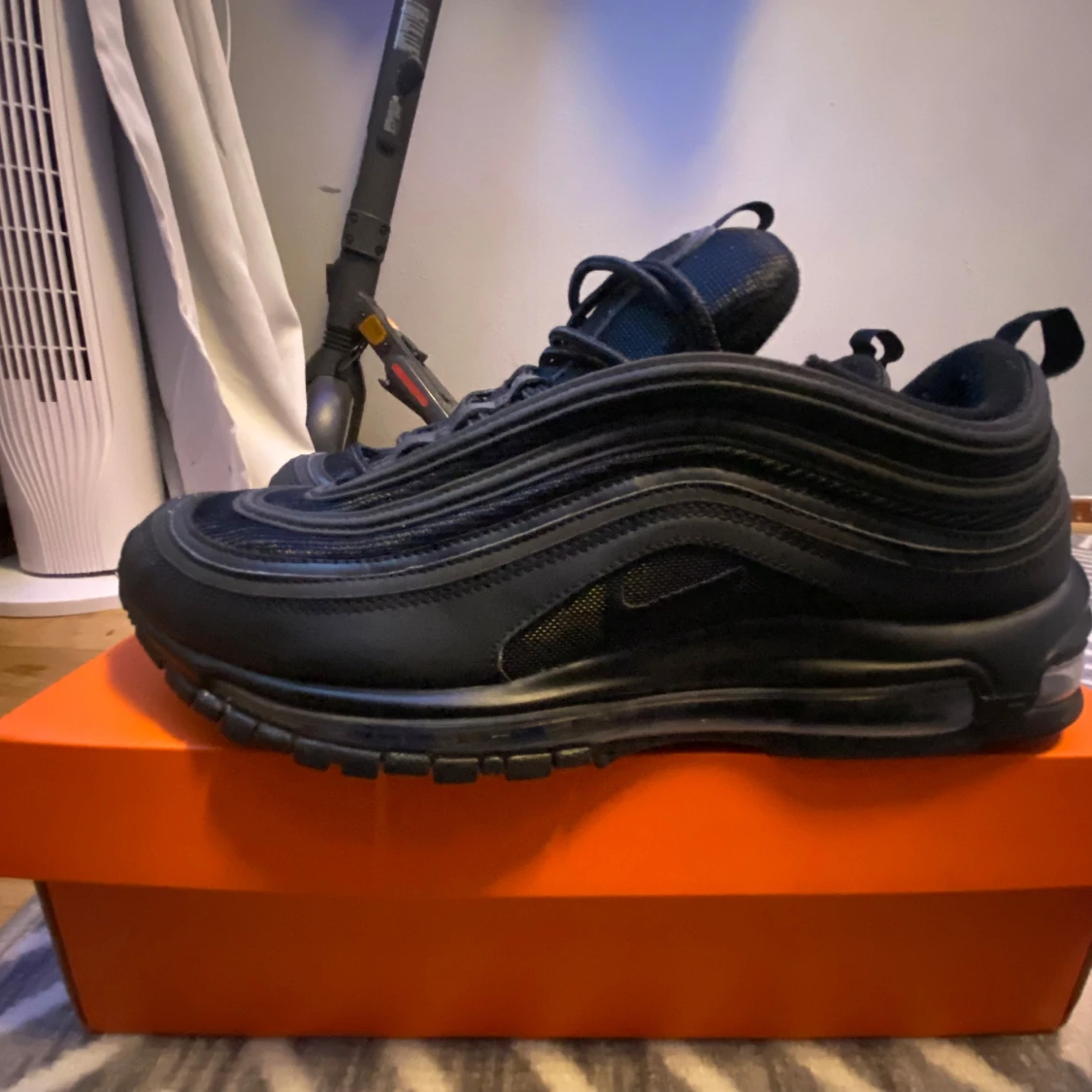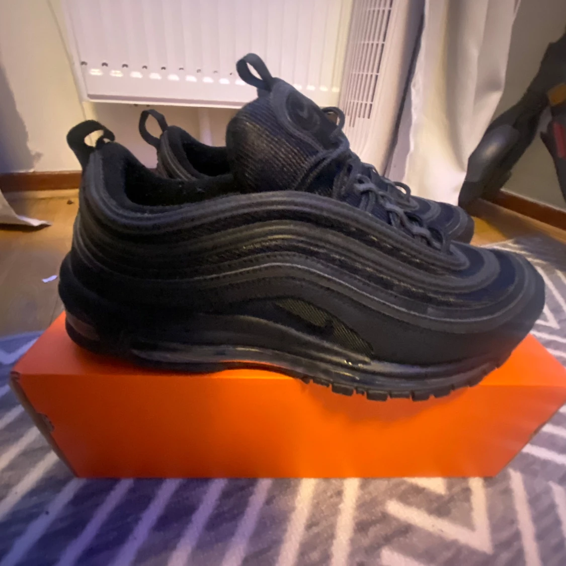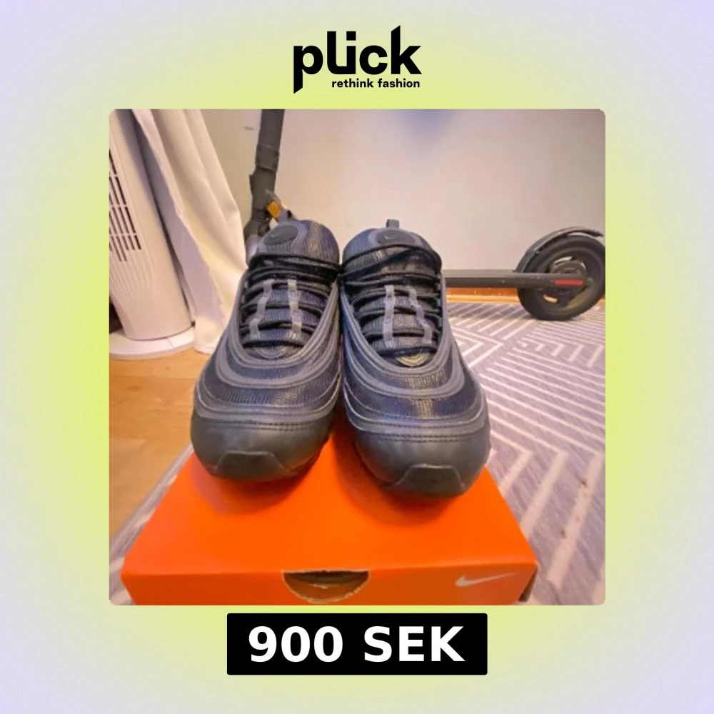 Nike Air Max 97 i färgen svart. Skorna har inte kommit till användning då dem är för små. Har använts 1 gång tidigare då det finns lite grus på under sulan. Annars är skorna i perfekt skcik. Mycket billigare alternativ än att köpa nyare par. Original box medföljer samt kvitto på sista sliden