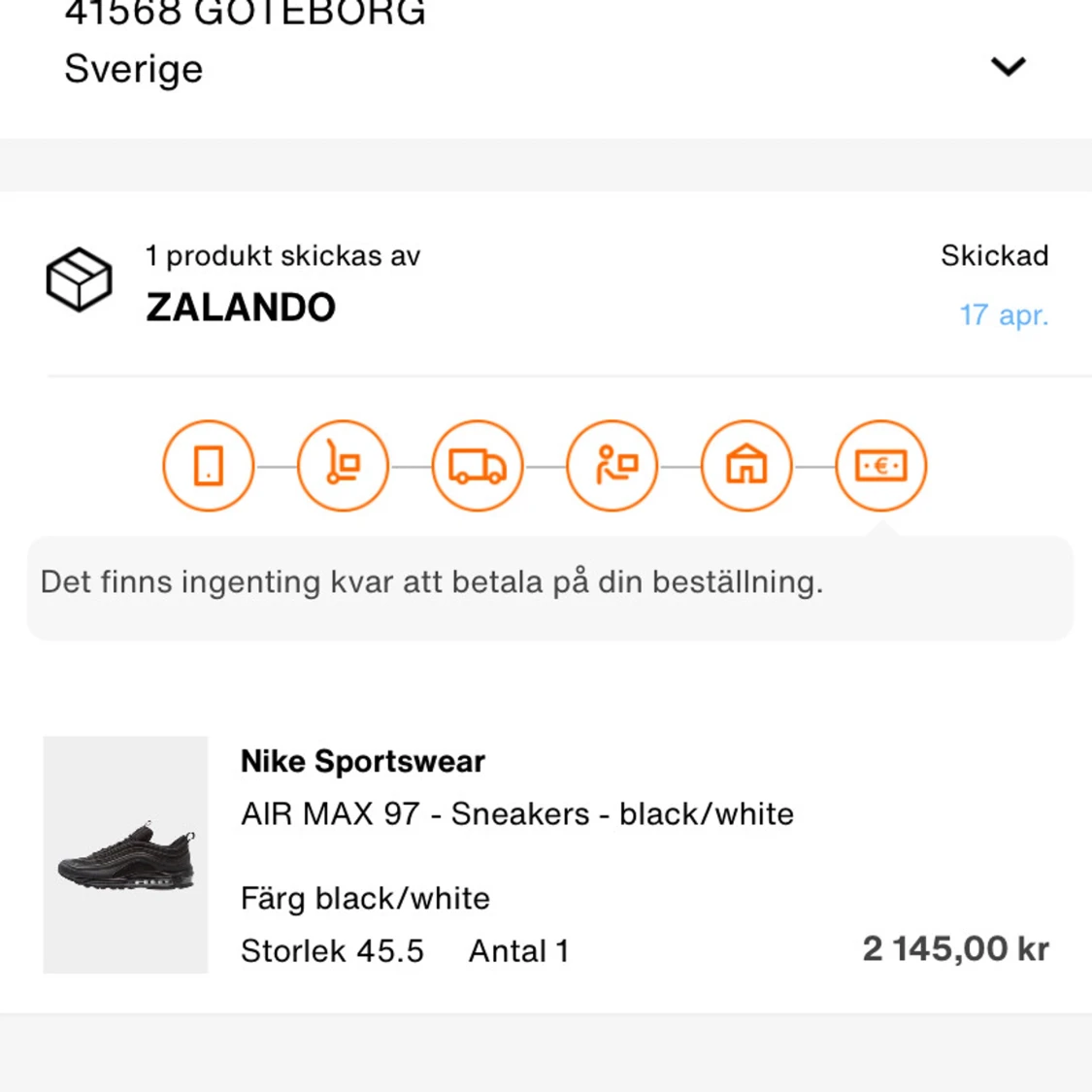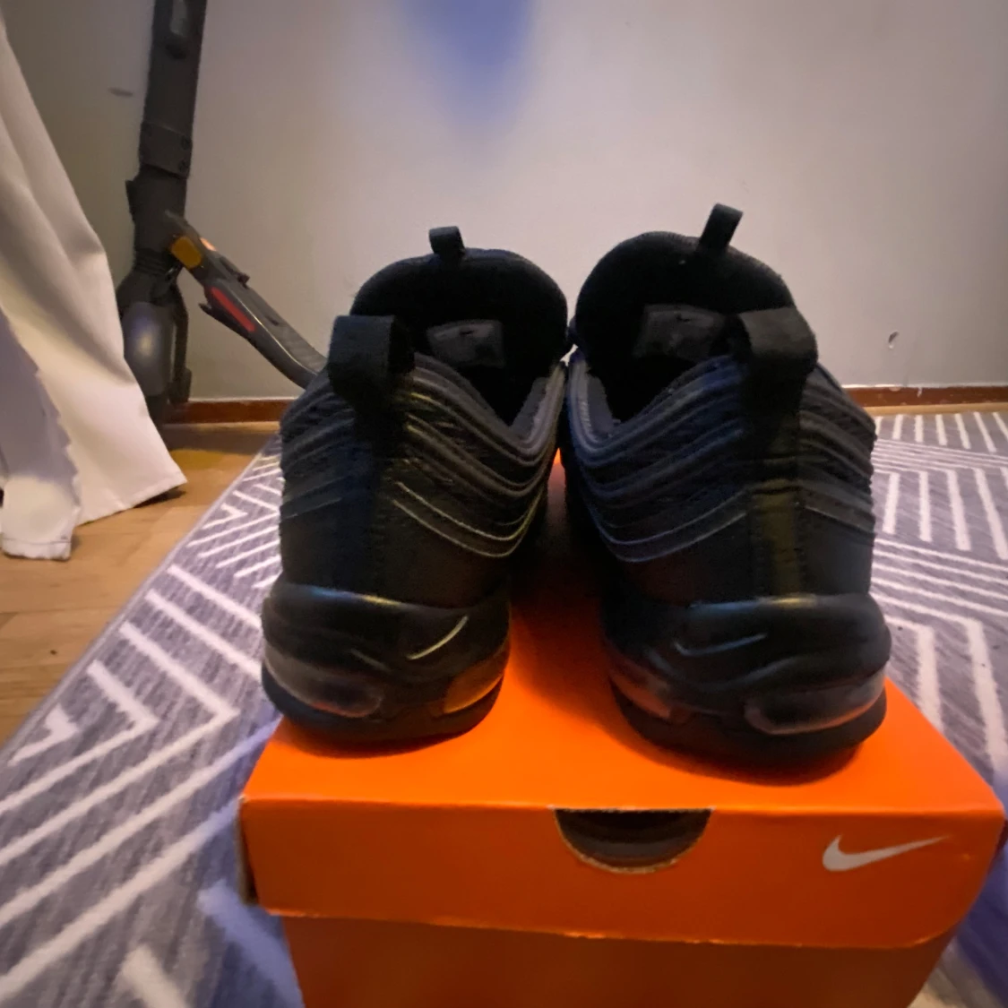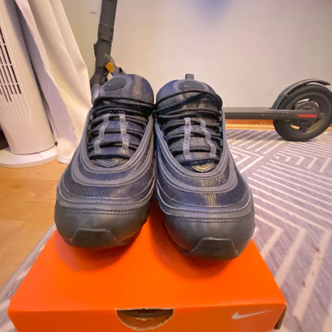 Nike Air Max 97 i färgen svart. Skorna har inte kommit till användning då dem är för små. Har använts 1 gång tidigare då det finns lite grus på under sulan. Annars är skorna i perfekt skcik. Mycket billigare alternativ än att köpa nyare par. Original box medföljer samt kvitto på sista sliden