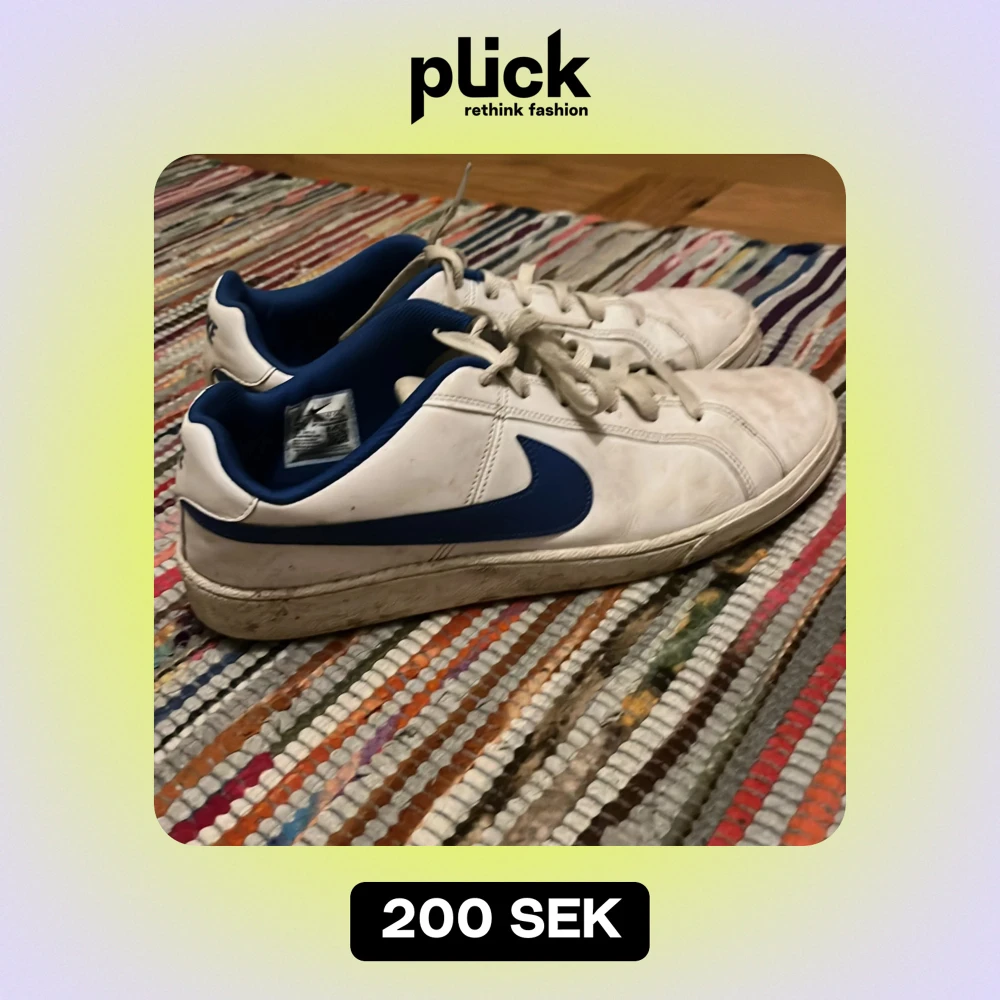 Säljer ett par vita Nike sneakers med blå detaljer. De har en klassisk design med snörning och är i bra skick, men lite smutsiga. Perfekta för vardagsbruk eller träning. Storleken är herr 45.