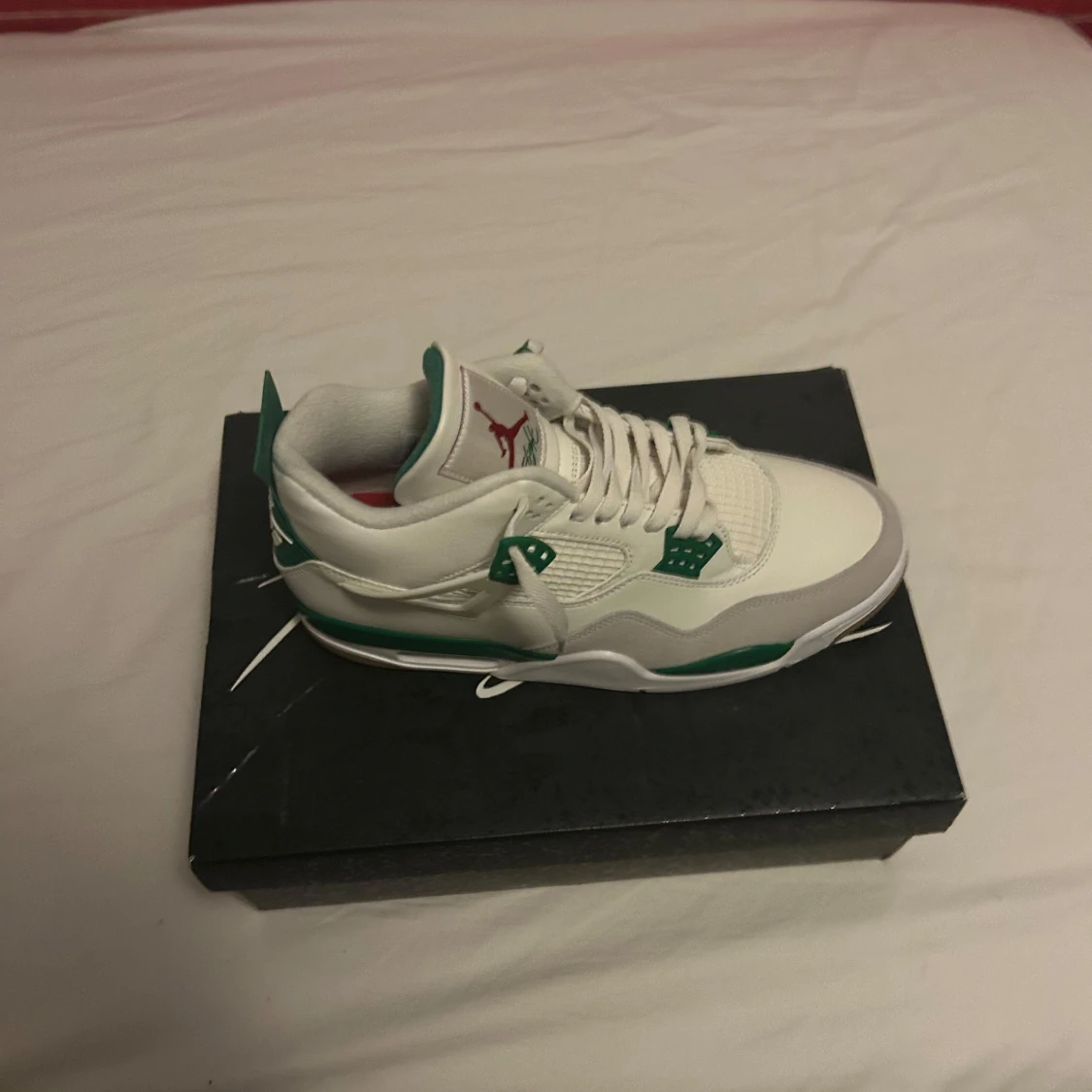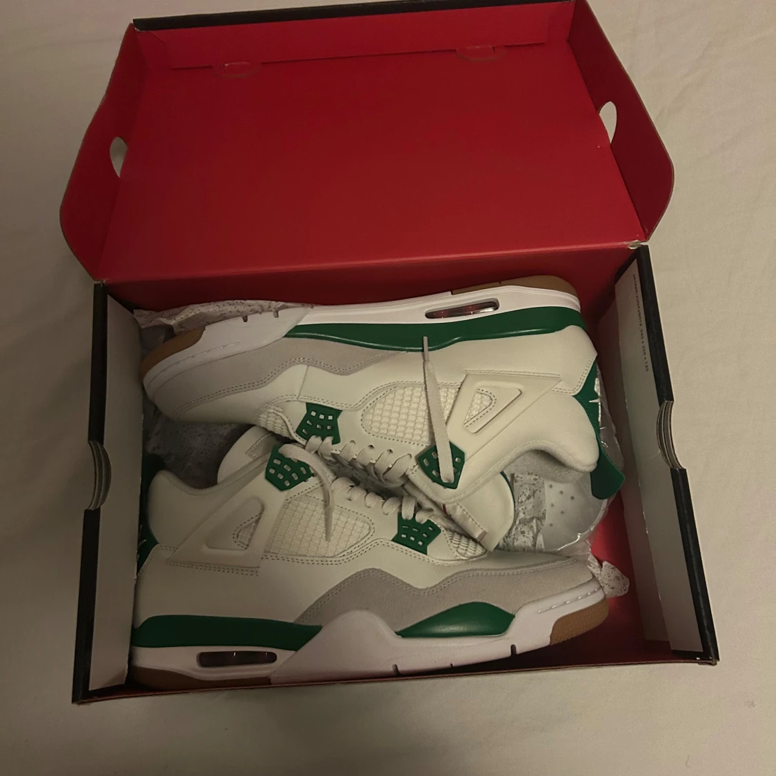 Snygga Nike Air Jordans i vitt med gröna detaljer. Skorna har en klassisk design med snörning och en bekväm sula. Perfekta för dig som vill ha en stilren look med en touch av färg.