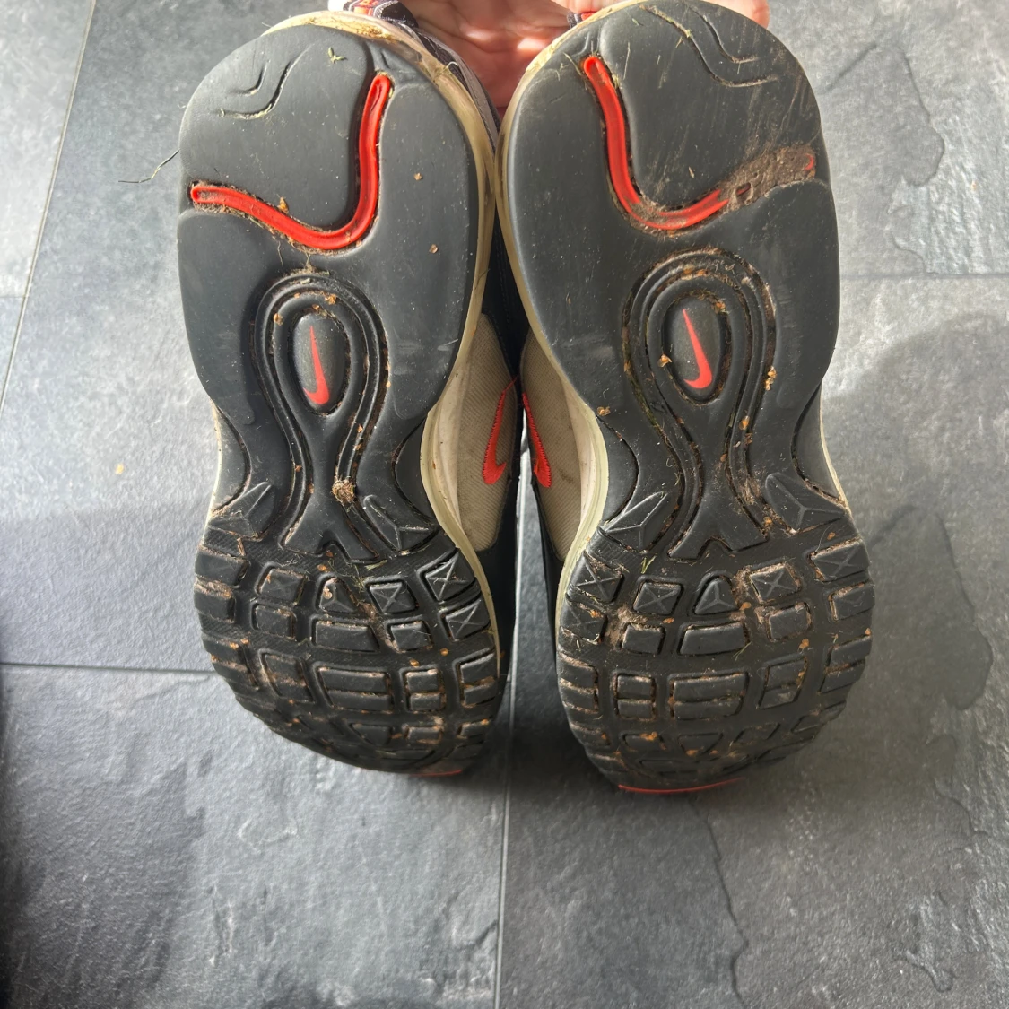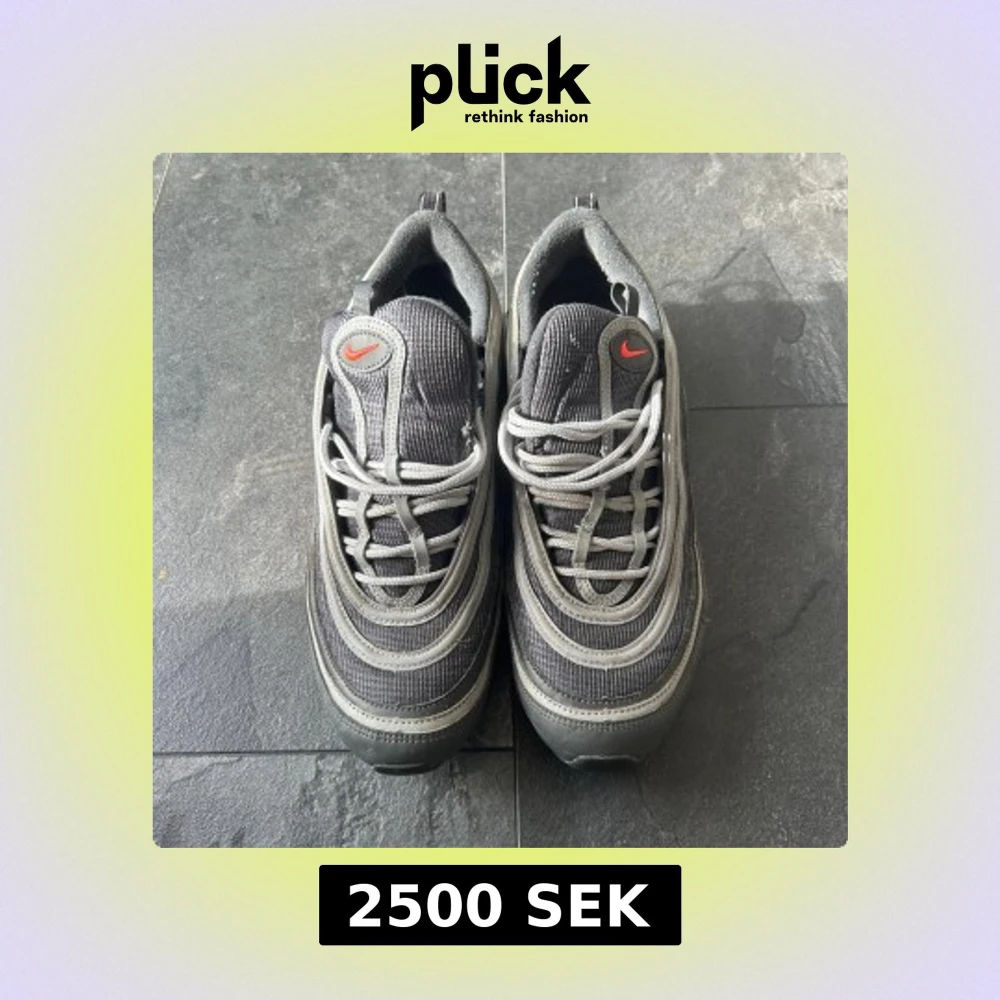 Säljer ett par Nike Air Max 97 i grått och silver med röda detaljer. Skorna har den klassiska vågiga designen, snörning och en synlig Air Max-sula. Ovandelen är i syntet och mesh för en sportig look. Perfekta för dig som gillar streetwear och sneakers med attityd.