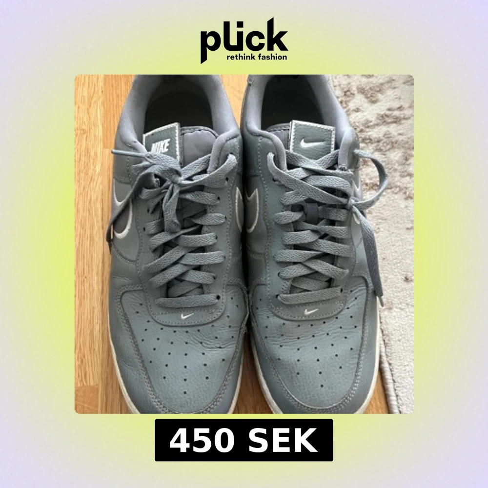 Säljer ett par grå Nike Air Force sneakers med klassisk design och vit swoosh på sidan. Skorna har snörning, rund tå och perforerade detaljer framtill för extra ventilation. Perfekta för dig som gillar stilrena och tidlösa sneakers. Har köpt de för 1200kr och säljer de för bara 500kr ( vid snabb affär kan priset diskuteras)