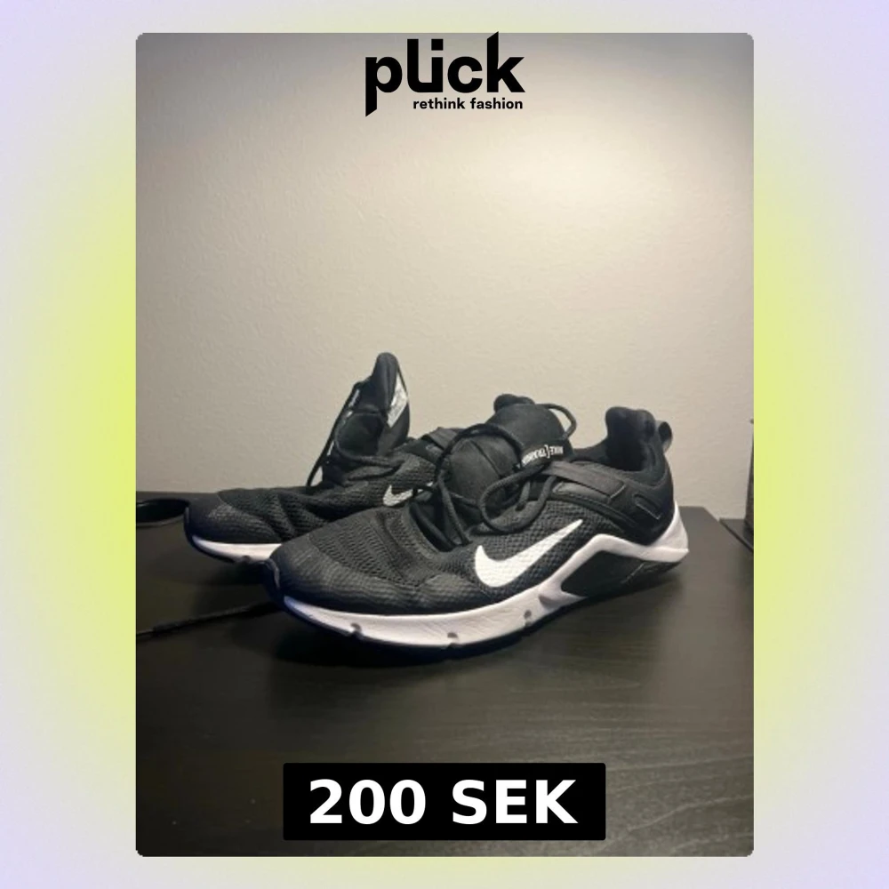 Snygga svarta Nike sneakers med vit sula och klassisk vit swoosh på sidan. Ovandelen är i mesh för bra andningsförmåga och skon har snörning. Perfekta för en sportig och modern stil.
