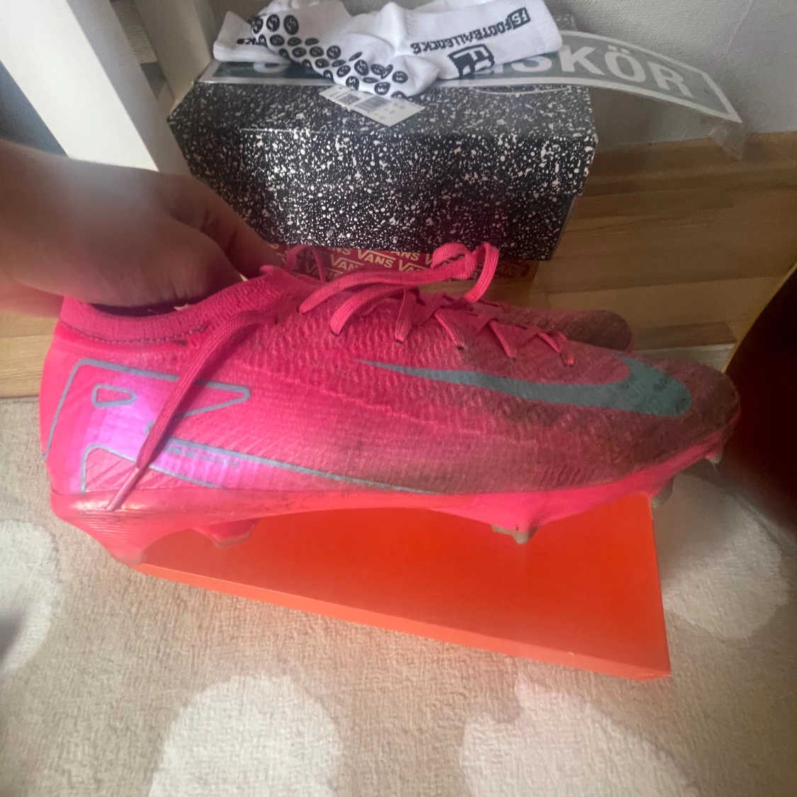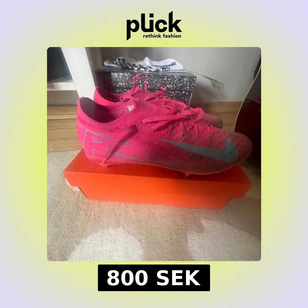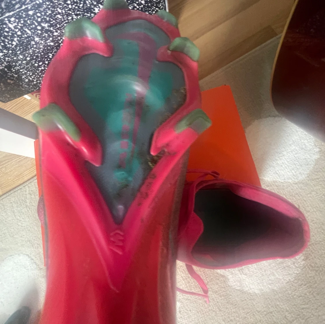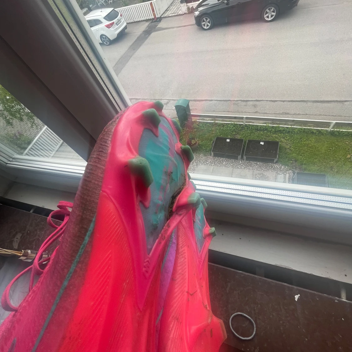 Säljer ett par Nike fotbollsskor i en riktigt snygg rosa färg med turkosa detaljer och sula. Perfekta för dig som vill sticka ut på fotbollsplanen. Skorna har gått upp lite vid en dobb men annars är det i bra skick.