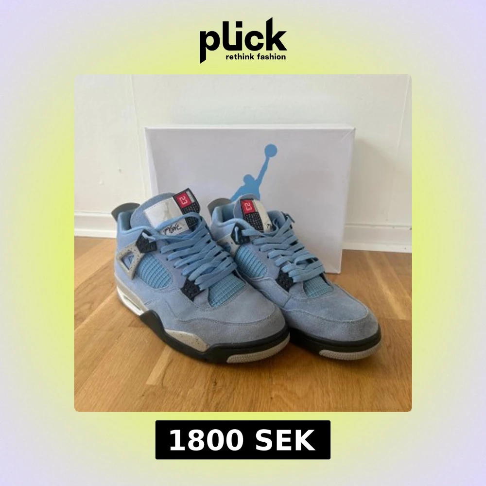 Tjena, säljer mina Nike Air Jordan 4 University Blue sneakers i ljusblå mocka med grå och svarta detaljer. Skorna har meshpaneler, snörning och ikoniska Jumpman-loggor på hälen. Skorna har använts ett fåtal gånger. Box och nya snören ingår.
