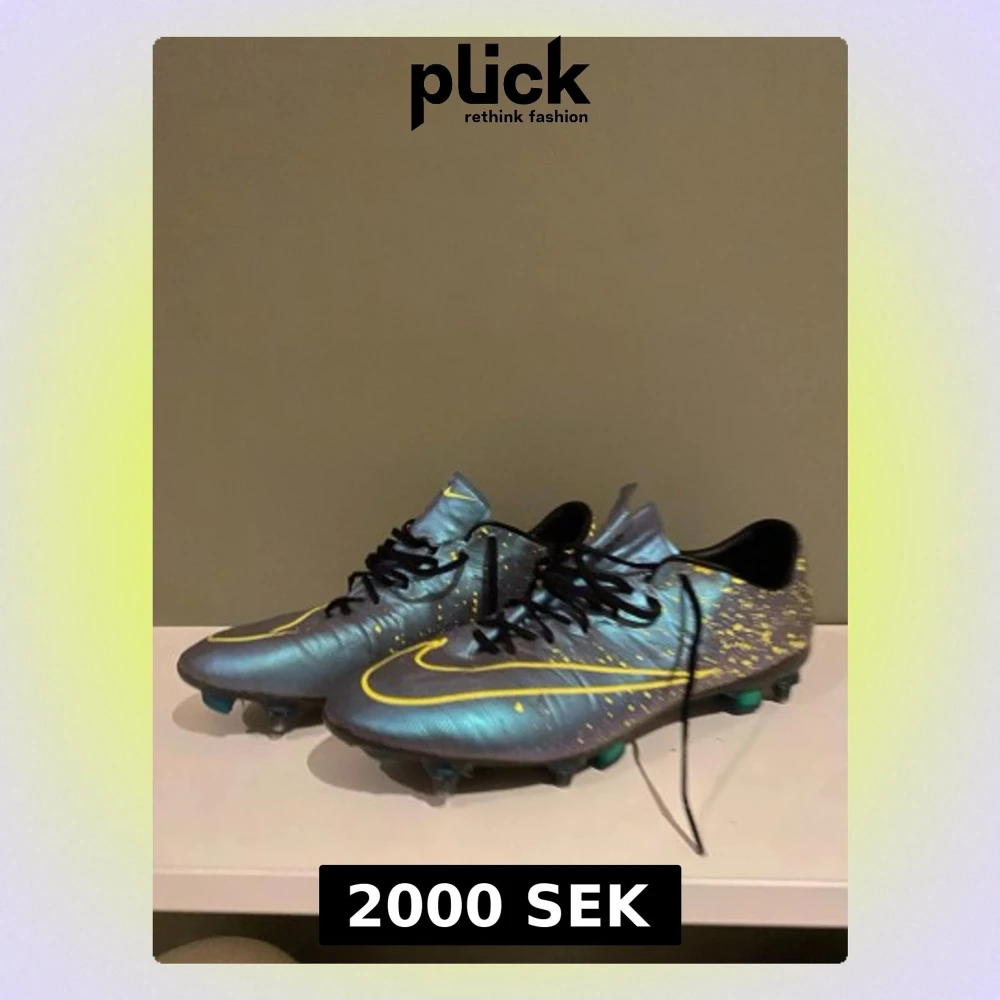 Storlek 45 cm 29 pris kan förhandlas Snygga Nike fotbollsskor i metallicblå med gula detaljer och svarta skosnören. Skorna har en låg profil, snörning och mönstrad ovandel med gula stänk. Perfekta för dig som vill sticka ut på planen.