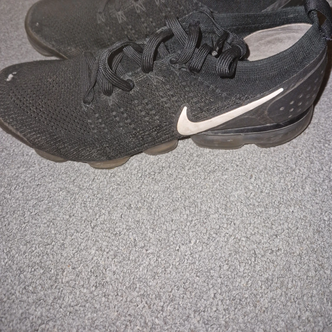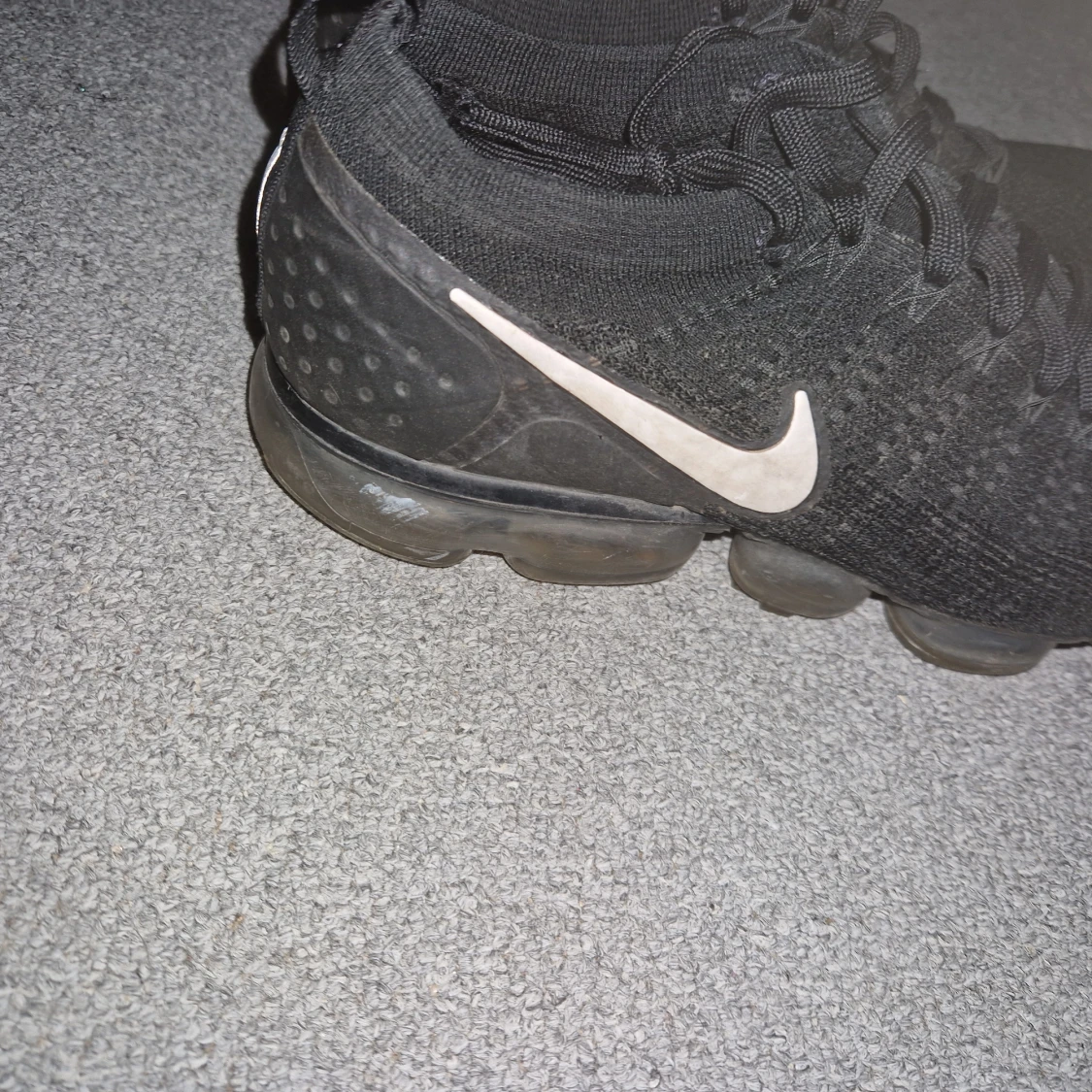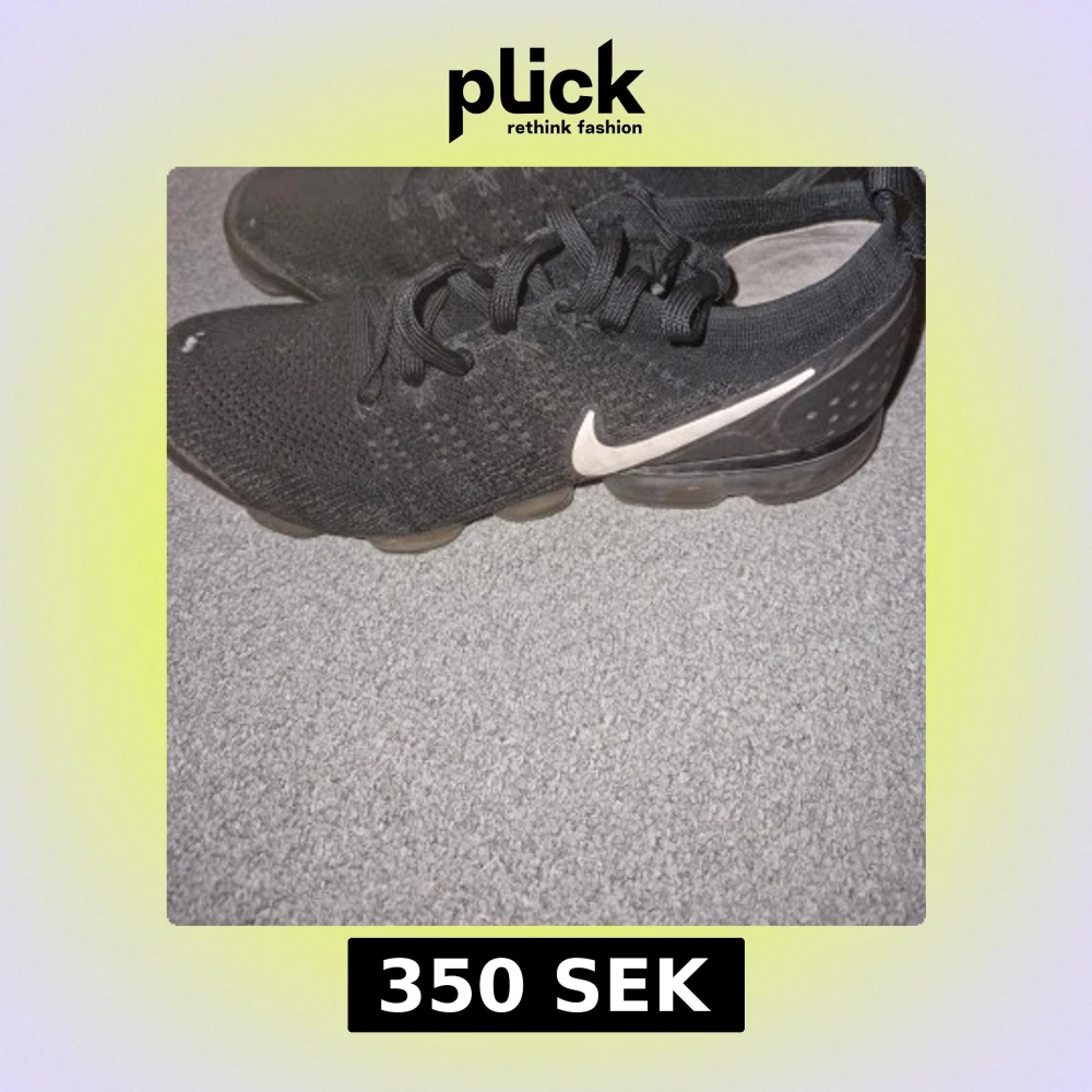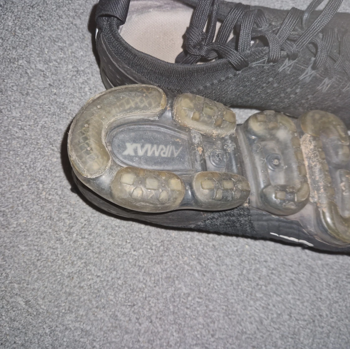 Säljer ett par svarta Nike Vapormax sneakers med en luftig och flexibel design. Skorna har en synlig Air Max-dämpning och snörning för en säker passform. Perfekta för både träning och vardag.