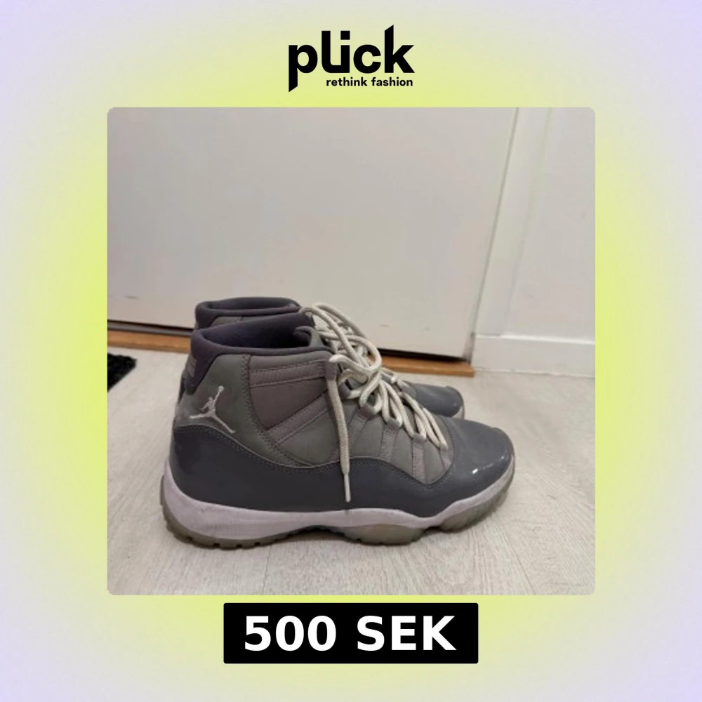 Säljer ett par gråa Nike Air Jordan 11 med vit sula och vita snören. Skorna har en blandning av mocka och glansigt material på ovandelen, samt klassisk Jumpman-logga på sidan. Mellanhöga och riktigt ikoniska för dig som gillar streetwear.