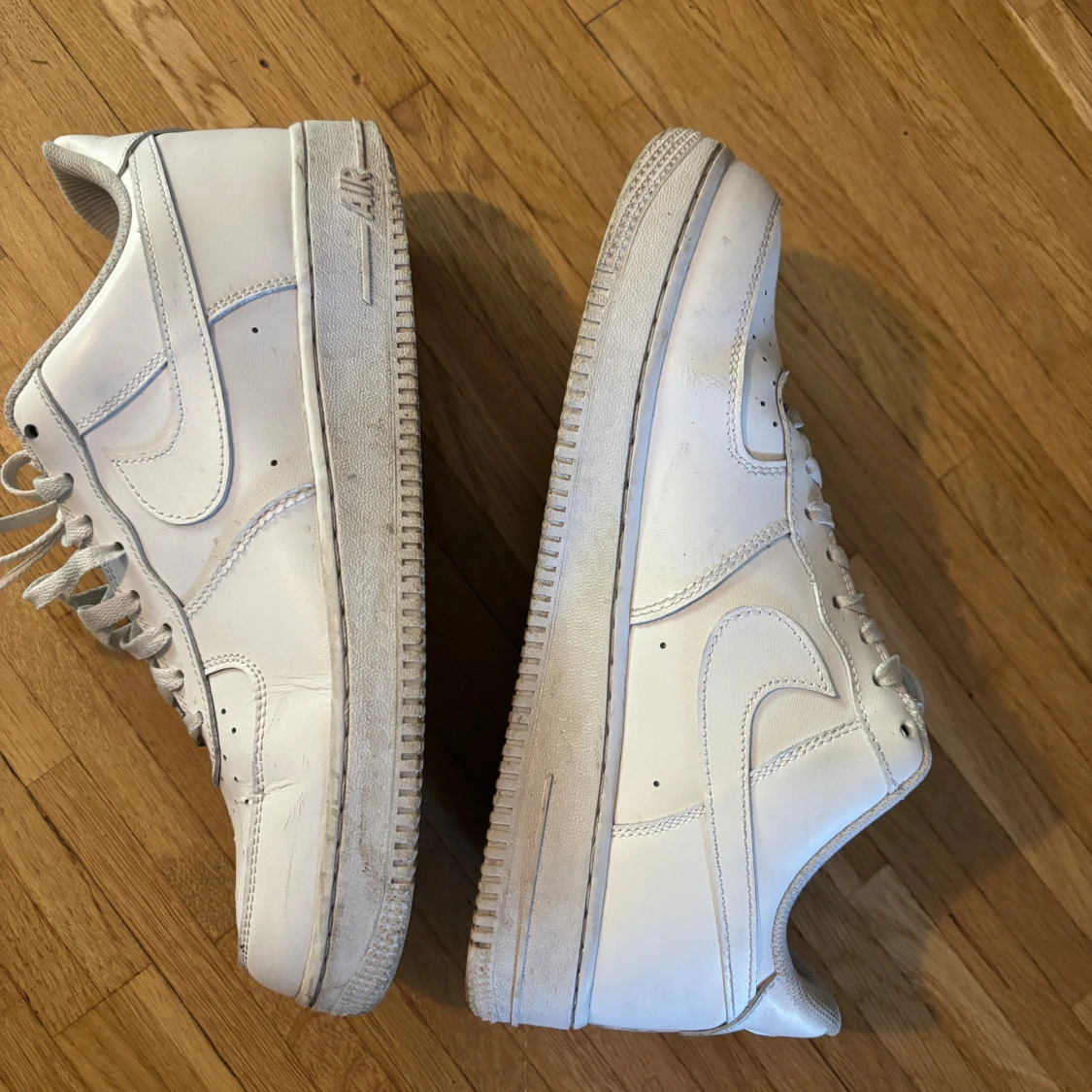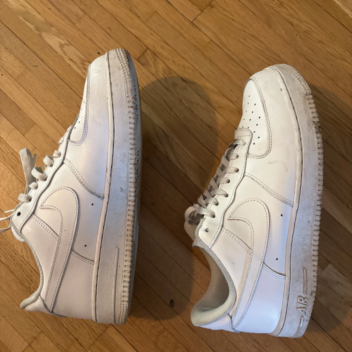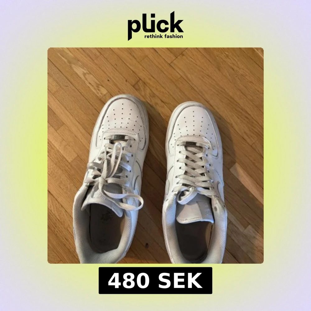 Klassiska Nike Air Force 1 sneakers i helvitt skinn med perforerad tå och vit sula. Snygg och tidlös modell med snörning och låg profil, perfekt för dig som gillar streetstyle. Ikonisk Swoosh-logga på sidorna och AIR-detalj på sulan.