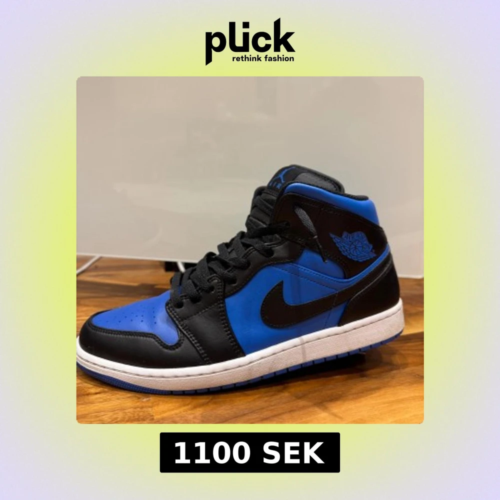 Snygga Nike Air Jordans i svart och blått med klassisk snörning. Skorna har en hög design med den ikoniska Air Jordan-loggan på sidan. Perfekta för dig som vill ha en stilren och sportig look.