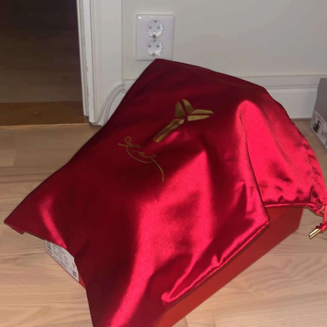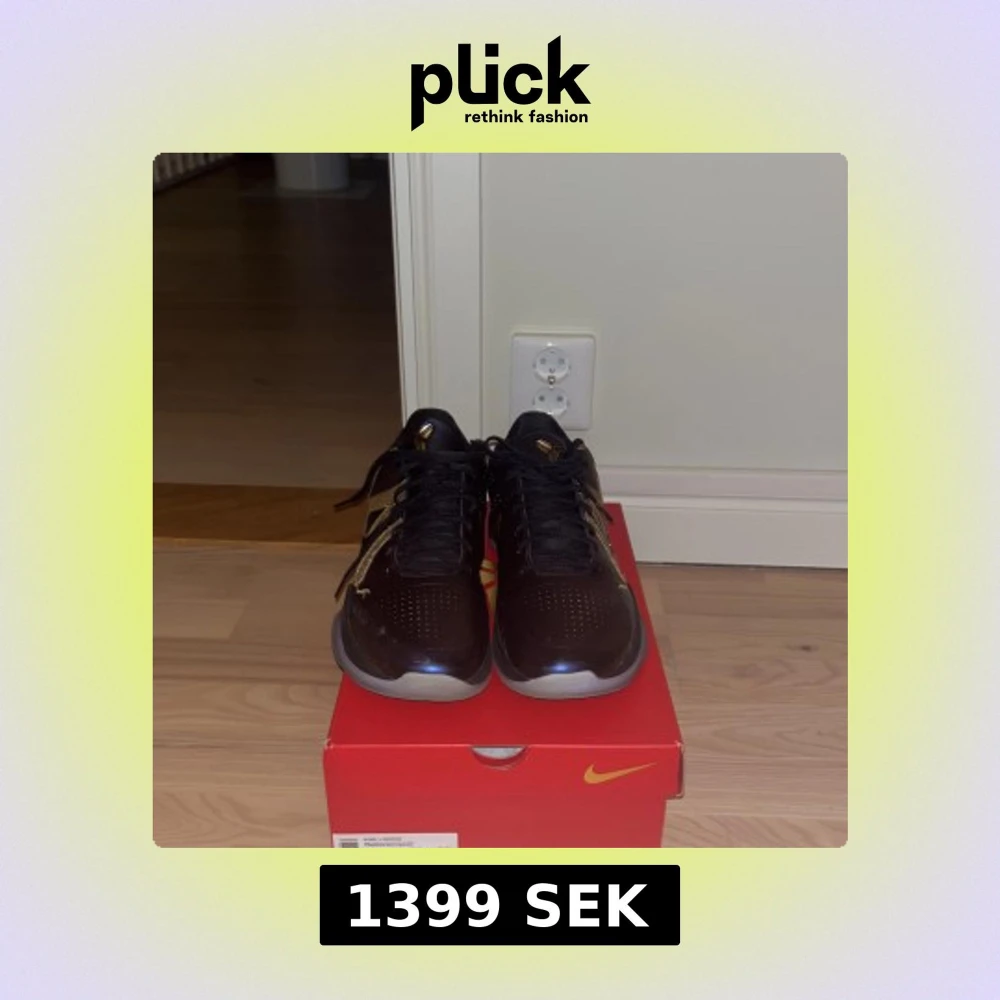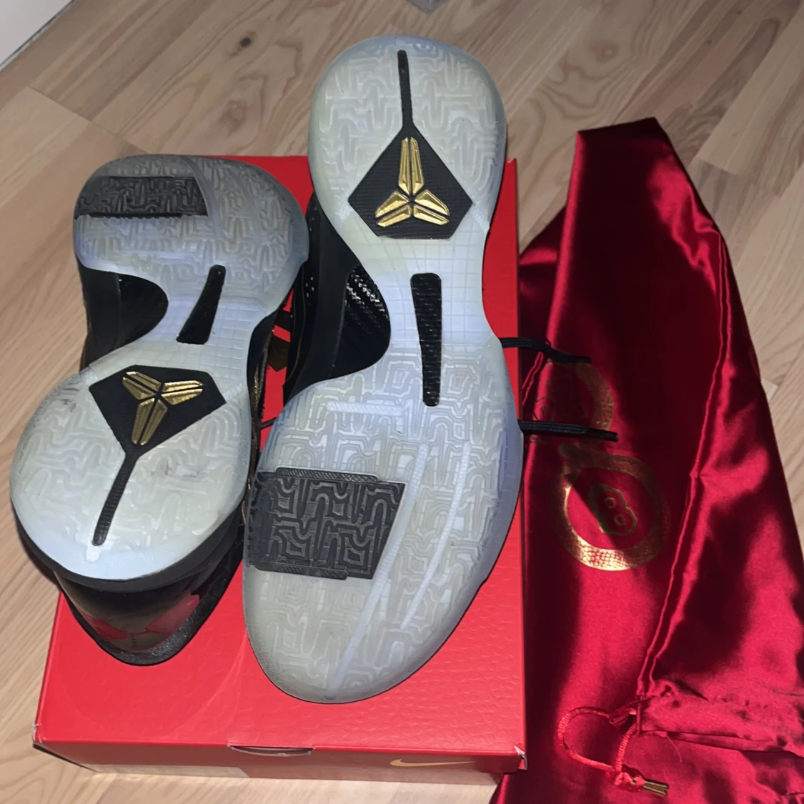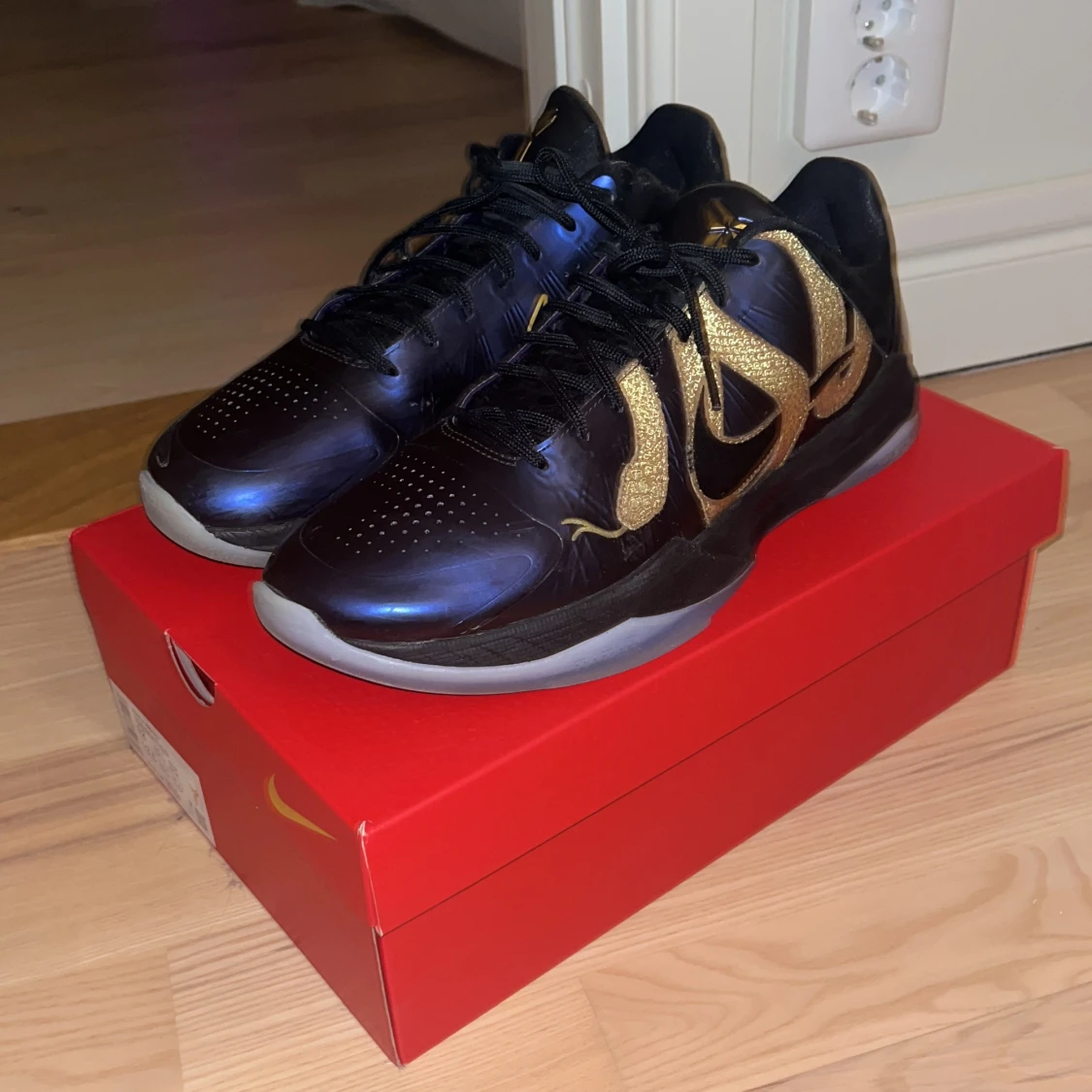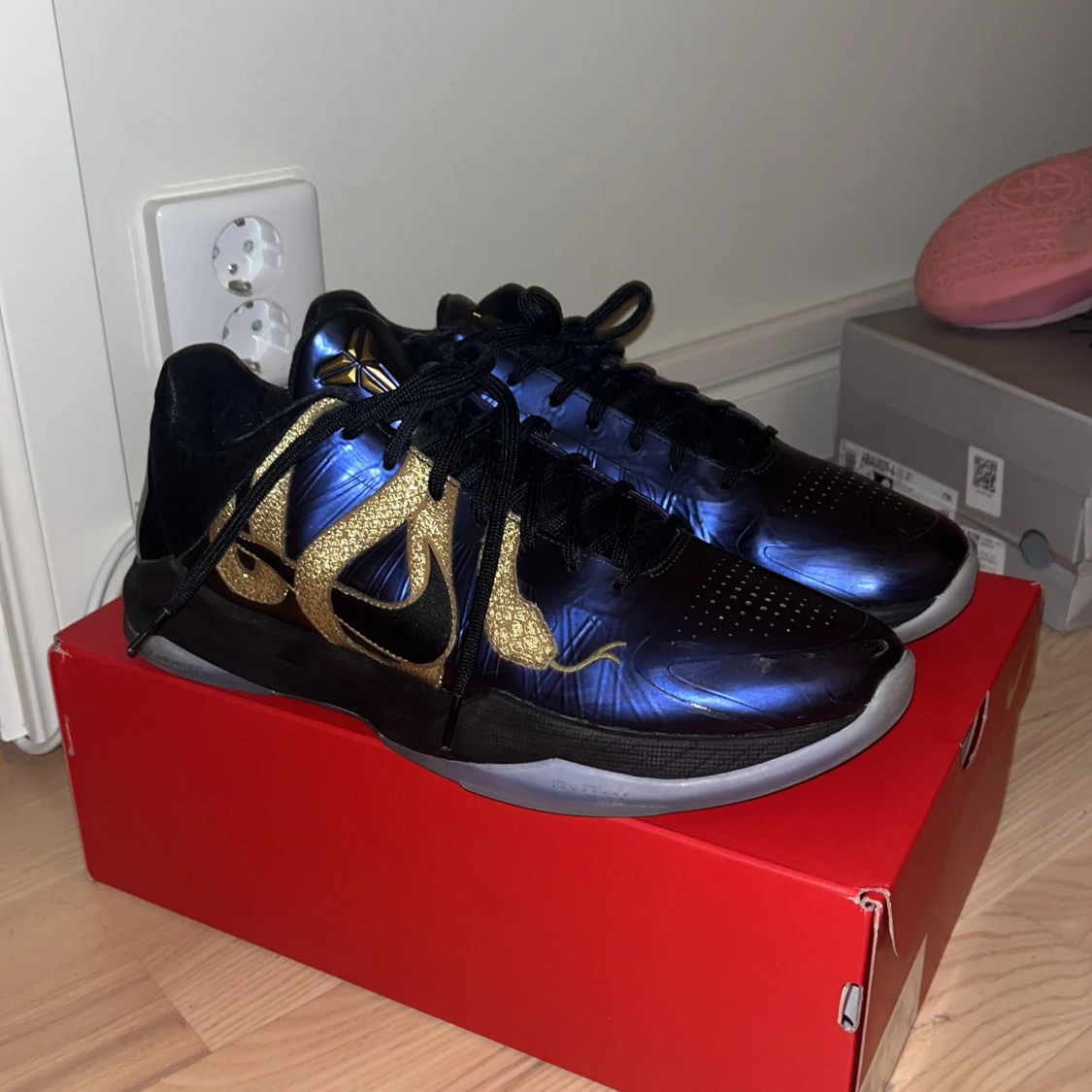 Säljer ett par Nike Kobe 5 Protro sneakers i svart med metallic guld-detaljer och svart snörning. Skorna har en låg silhuett, perforerad tå och en cool guldmönstrad swoosh på sidan. Kommer med originalröd box och exklusiv röd dustbag med Kobe-logga.