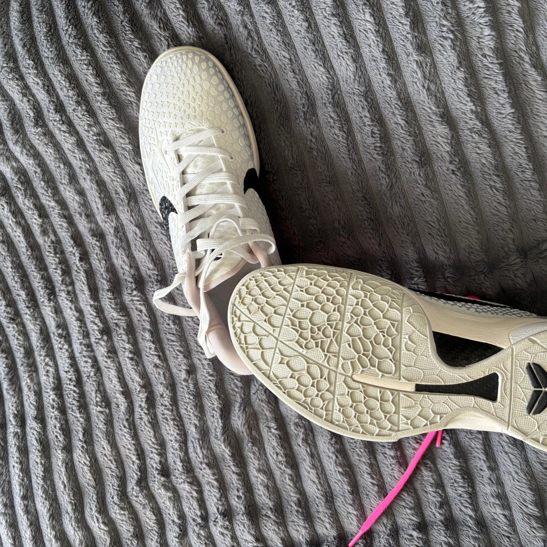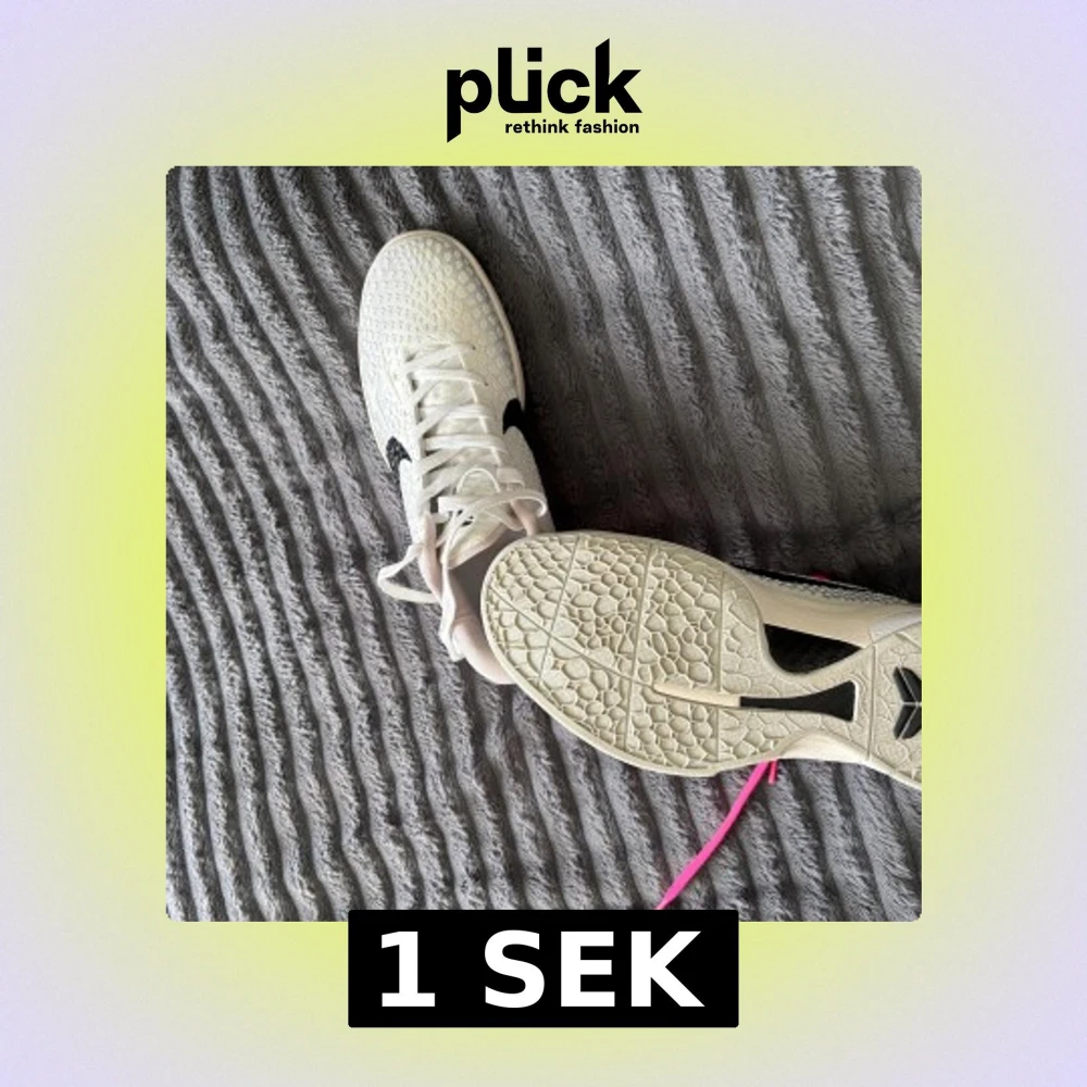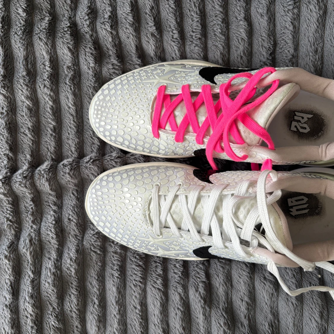 Säljer ett par vita Nike basketskor med coolt strukturmönster på ovandelen och svart swoosh. Ena skon har vita snören och den andra har neonrosa snören för extra attityd. Skorna har platt sula och är perfekta för inomhusspel.