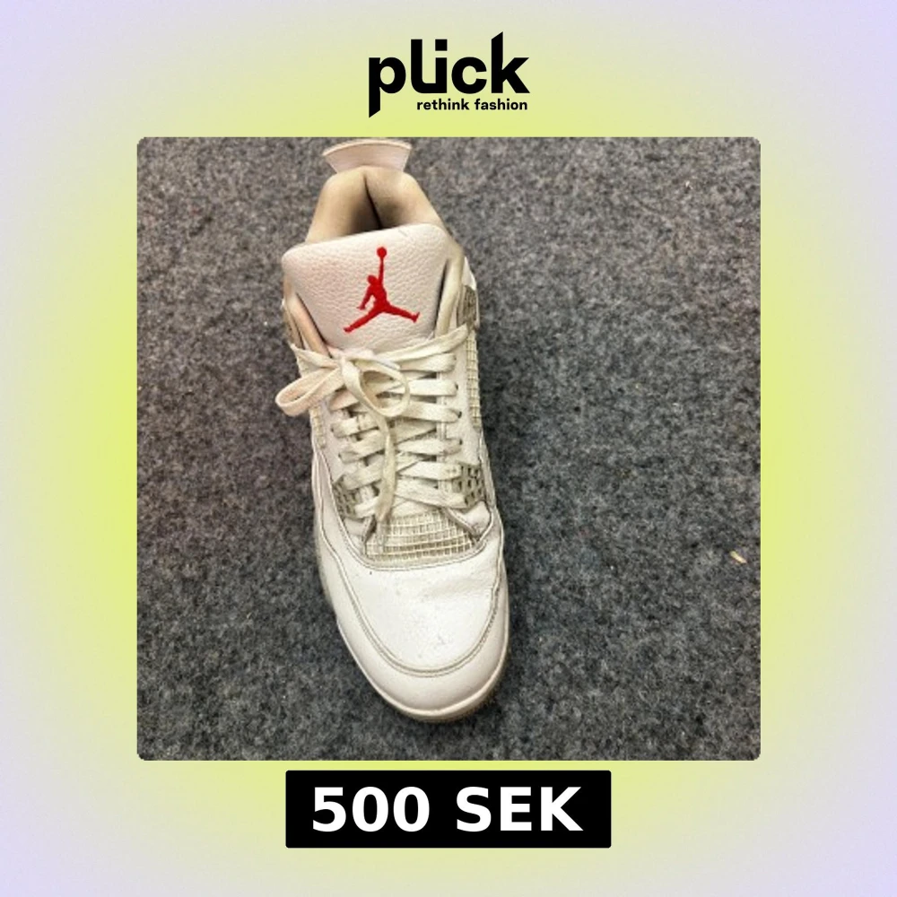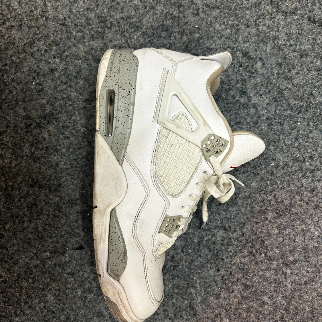 Säljer ett par Nike Air Jordan 4 Retro i vitt skinn med grå detaljer och röd Jumpman-logga på plösen. Klassisk siluett med snörning, meshpaneler och stänkmönstrad grå sula. Perfekta för dig som gillar ikoniska sneakers med streetkänsla.