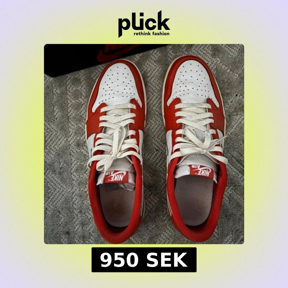 Säljer ett par Nike Air Jordan 1 Low OG i rött och vitt. Skorna har klassisk låg siluett, vit bas med röda paneler och vit swoosh på sidorna. Tjock vit sula med röd yttersula och snörning framtill. Perfekta för dig som gillar streetwear och sneakers.