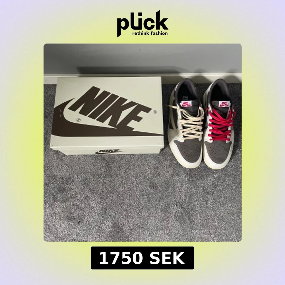 Säljer ett par Nike Air Jordan 1 Low Travis Scott med beige och bruna paneler, ikonisk omvänd Swoosh och röda broderade detaljer på hälen. Skorna har platt sula och rund tå, samt levereras med både beige och röda skosnören.