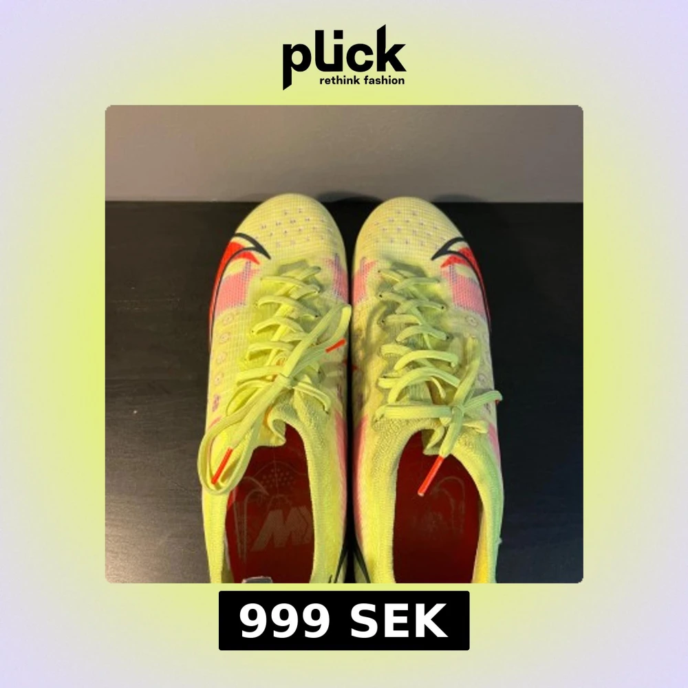 Nike Mercurial fotbollsskor i en cool ljusgul färg med röda och svarta detaljer. Skorna har snörning och en platt sula med dobbar i rött och svart för gräsplan. Ovandelen är tillverkad i syntetmaterial med ventilerande mesh och stora Nike-loggor på sidorna. Storlek-46, skick 9/10, pris 999kr eller högsbudande