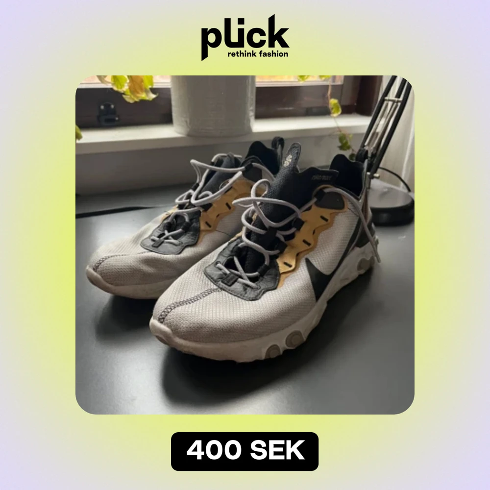 Nike React Element 55 Storlek 46 Köptes för några år sedan, använde de ett tag innan jag växte ur de. De är lite små i storleken, så om du vanligtvis använder 45 kanske de här passar dig perfekt 👍🏻 Inte jättemycket slitage, mestadels kanterna av sulor