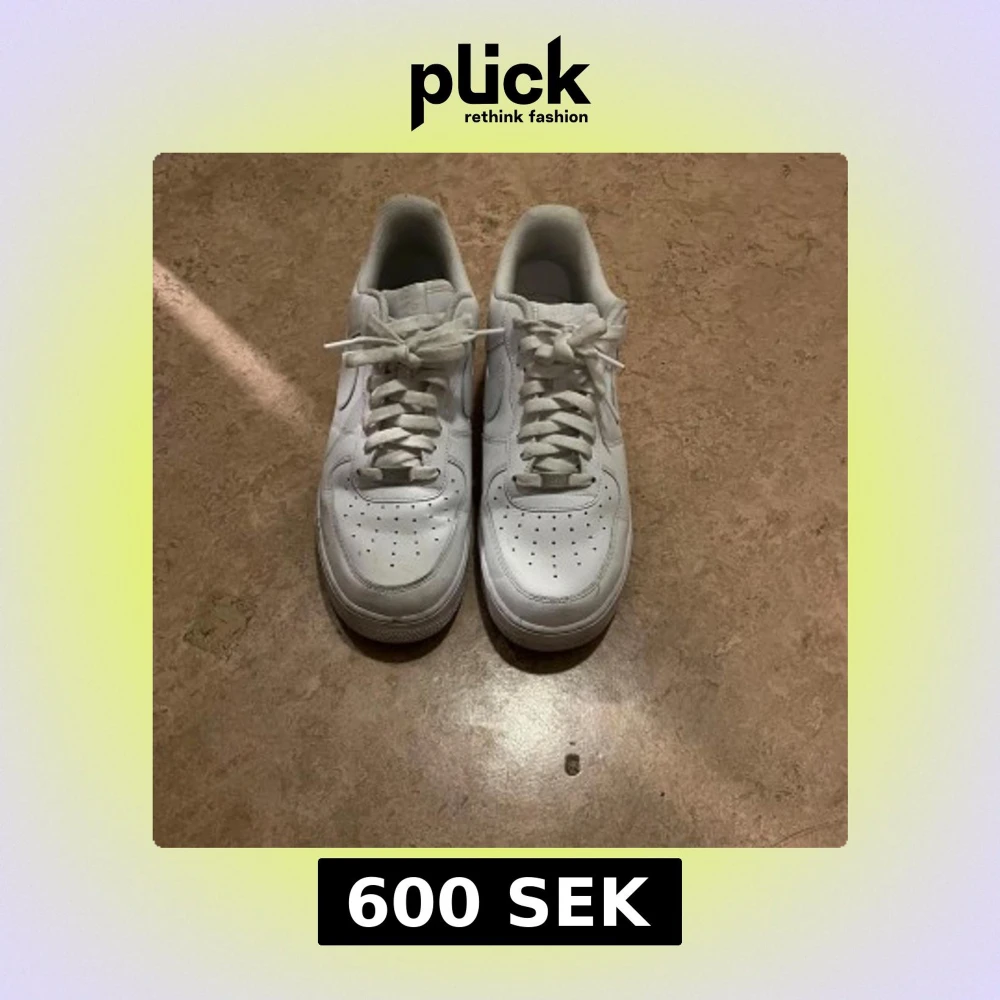 Säljer ett par klassiska vita Nike Air Force sneakers. De har en stilren design med snörning och perforerade detaljer på tån för extra ventilation. Perfekta för en casual look. Priset går att sänkas
