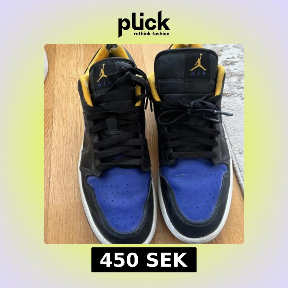 Säljer ett par Nike Air Jordan 1 Low med svart läder, blå detaljer på tå och sidor samt gula insidor. Klassisk Jumpman-logga på plösen och AIR-tryck. Skorna har svart snörning och vit sula. Vid snabbt affär kan priset diskuteras.