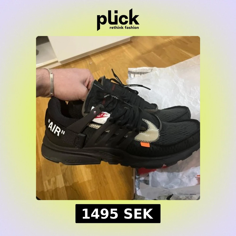Nike x Off-White Presto sneakers i svart mesh med vita detaljer och ikonisk Off-White text på hälen. Swoosh-logga i vitt med synlig zigzag-söm, svarta samt oranga snören med 'SHOELACES'-text och röd Nike-tagg på plösen. Snygg och unik design för dig som gillar streetwear.