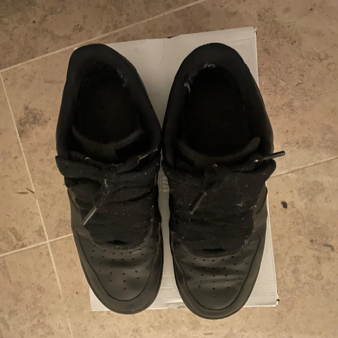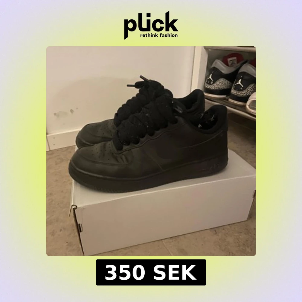 Säljer mina svarta Nike airforce, har slipat hål för rope lace men tröttnade på rep så satte tjockare snören istället, creasade men inte super dåligt skick, går att trä i rep om man vill de, storlek 44