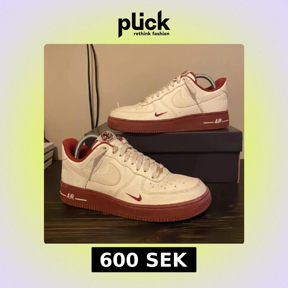 Nike Air Force 1 40th Anniversary sneakers i vitt skinn med röda detaljer och röd sula. Låg modell med klassisk snörning, perforerad tå och broderad Nike Air-logga på hälen. Insida i rött tyg och liten röd swoosh på sidan. Perfekt för dig som gillar unika sneakers. Nypris 2000 kr mitt pris 450