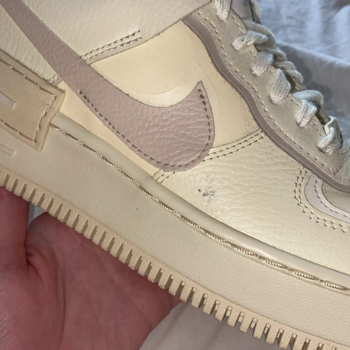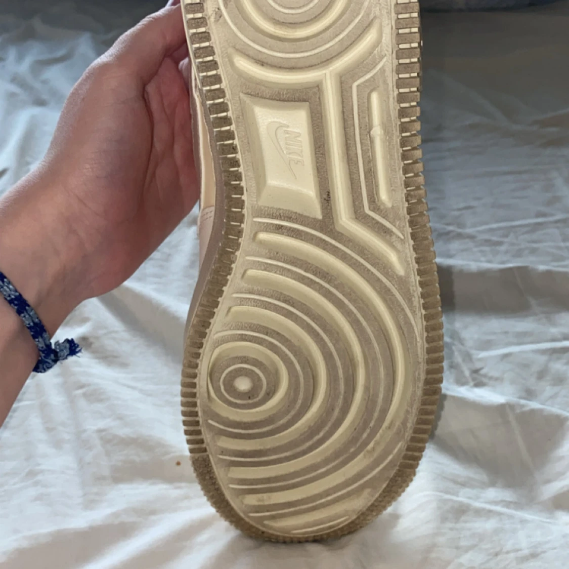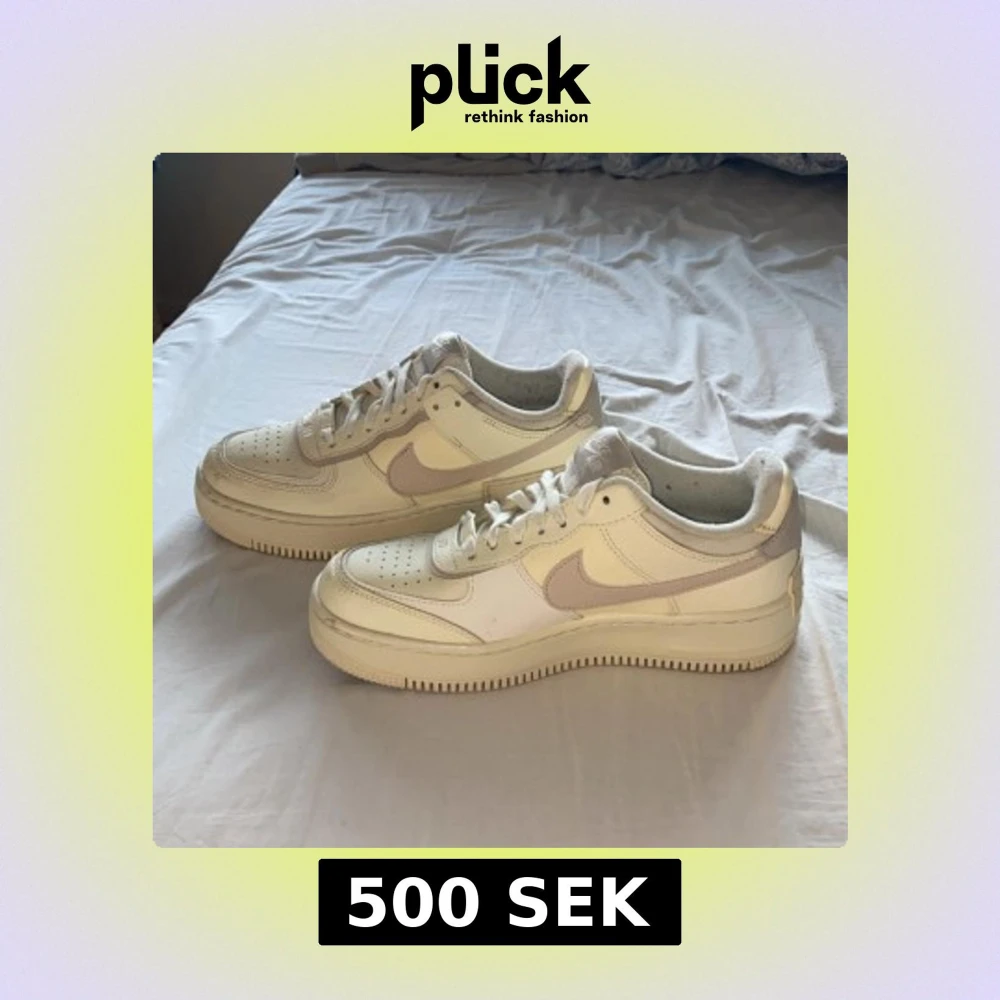 Säljer ett par Nike Air Force 1 sneakers i en beige och vit färgkombination. Använda några gånger så finns lite skavanker och fläckar men är generellt i bra skick! Har stått i hallen i några år så är lite dammiga inuti 😅🤭