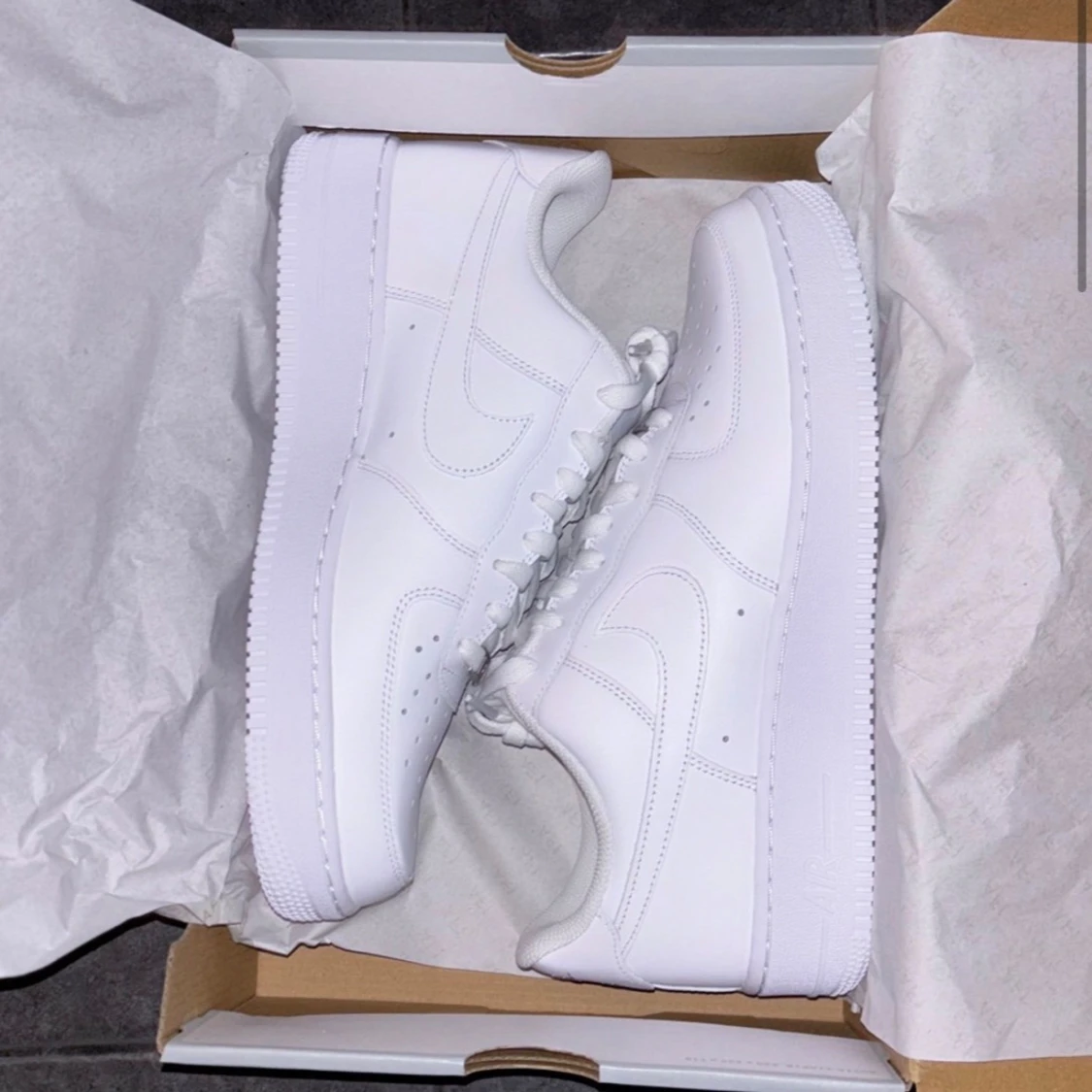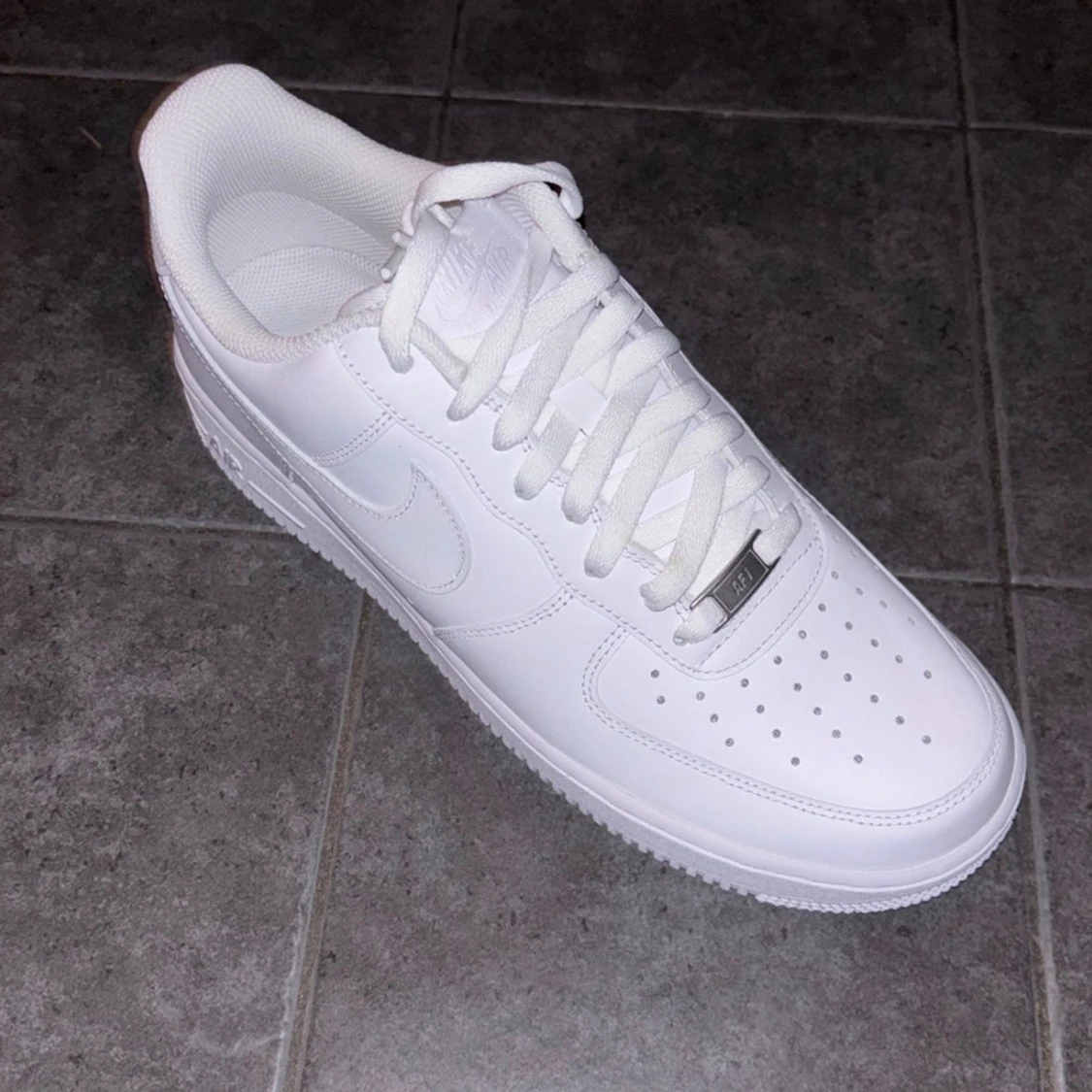 Klassiska Nike Air Force 1 sneakers i helvitt skinn med vit sula och snörning. Ikonisk siluett med rund tå och perforerade detaljer på tån för extra ventilation. Perfekta för dig som vill ha en clean och tidlös look.