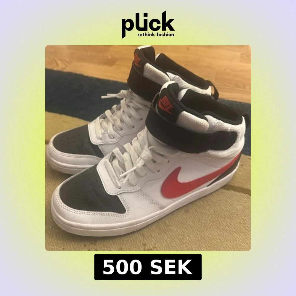 Säljer ett par Nike Air Force 1 High sneakers i vitt skinn med svarta och röda detaljer. Skorna har klassisk röd swoosh, svart tå och häl, samt svart kardborreband vid ankeln. Tjock vit sula och snörning framtill. Perfekta för dig som gillar retrostil och streetwear.