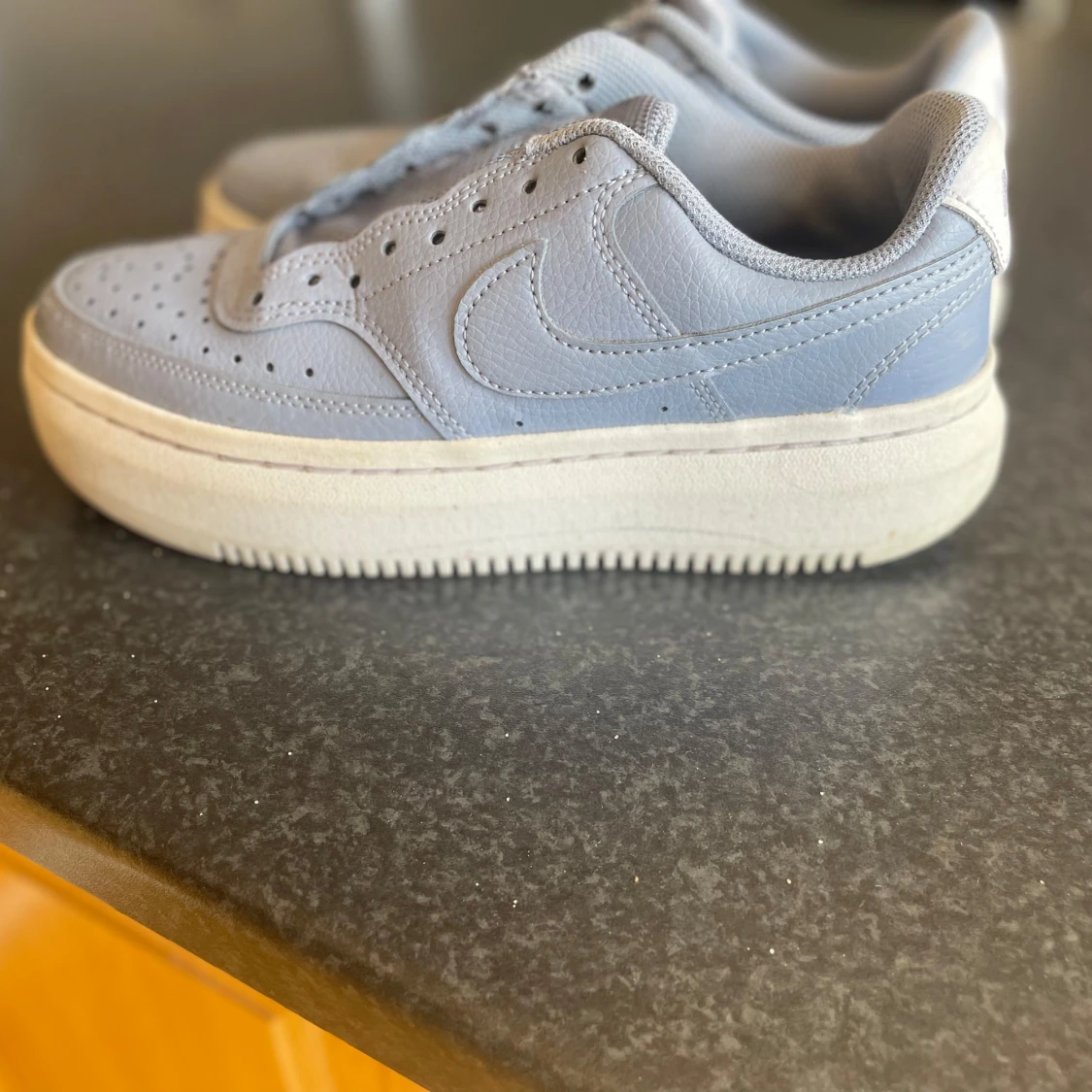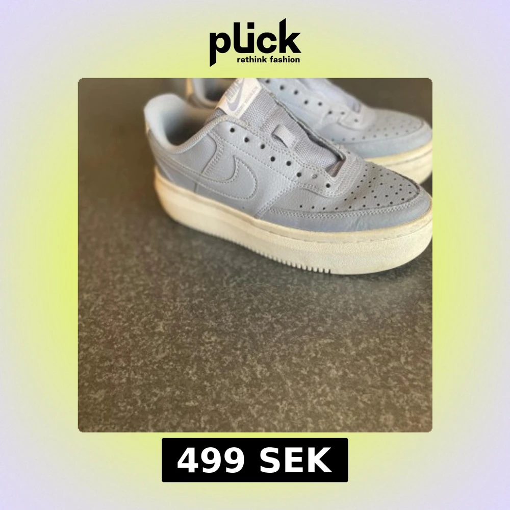 Snygga Nike Air Force 1 sneakers i ljus blå färg . Skorna har perforerad tå, rund tå och tydlig Nike-logga på sidan och hälen. Perfekt för dig som gillar stilrena och tidlösa sneakers med lite chunky vibe. Men…. Skorna saknar sko snören tyvärr men annars är dom rätt så fräscha använts några fåtal gånger 4 ish