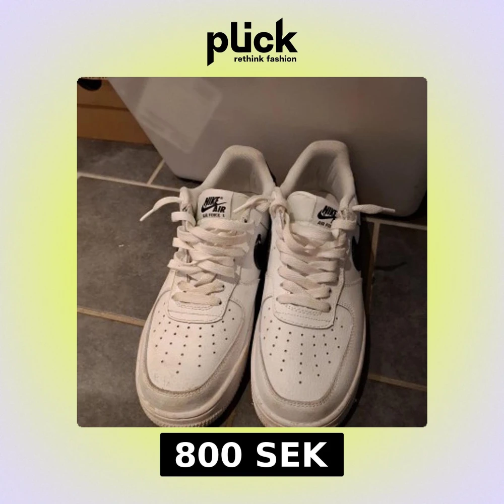 Säljer ett par klassiska Nike Air Force 1 sneakers i vitt med svarta detaljer. Skorna har en ikonisk design med snörning och perforerade detaljer på tån för ventilation. Perfekta för en stilren look.