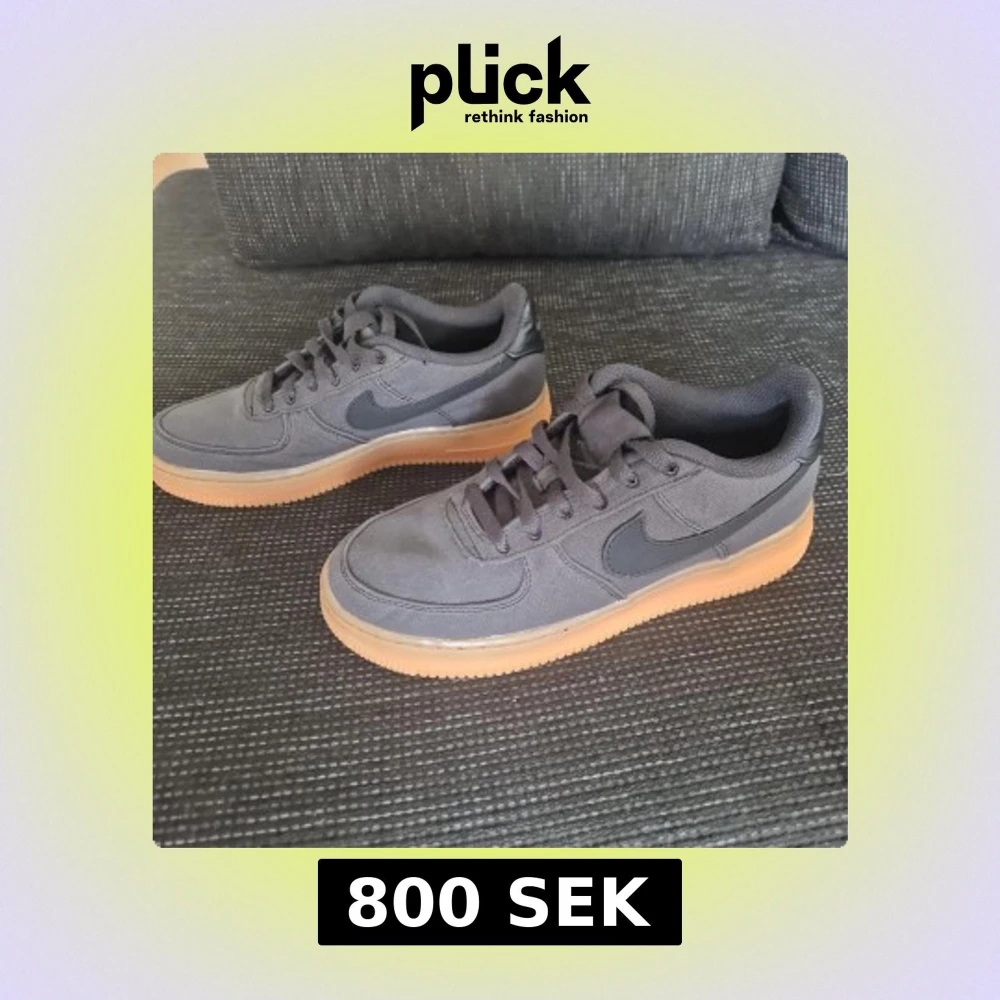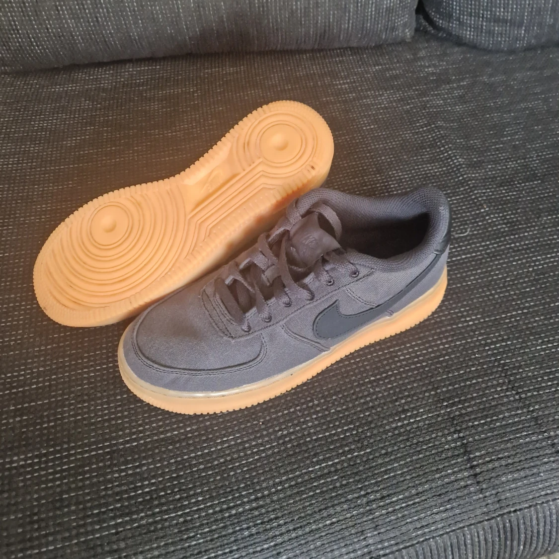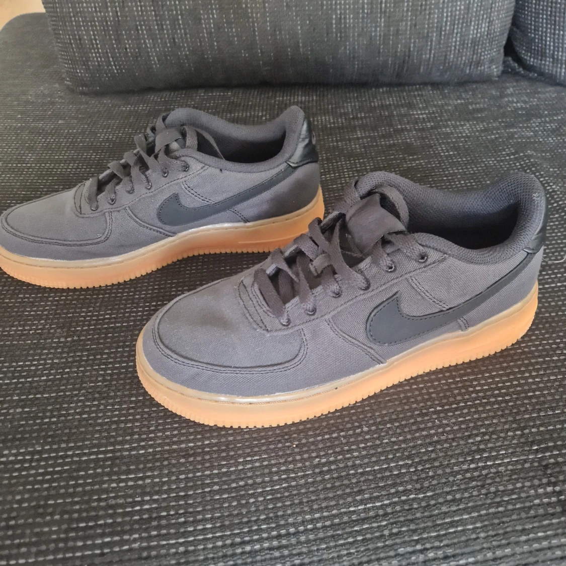 Säljer ett par svarta Nike Air Force 1 med klassisk gummifärgad sula. Skorna har snörning och är tillverkade i textil och syntetmaterial. Perfekta för dig som gillar stilrena sneakers med en twist. Swoosh-loggan på sidan och låg profil.
