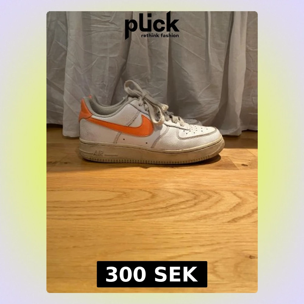 Nike Air Force 1 sneakers i vitt skinn med orange swoosh och häl. Låg modell med snörning och platt sula. Insidan har orange mesh-detaljer och grått foder. Klassisk rund tå och tydlig Air-logga på hälen. Perfekt för dig som gillar retrovibe och färg.