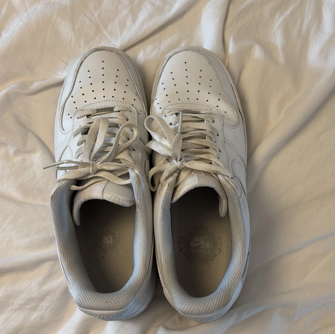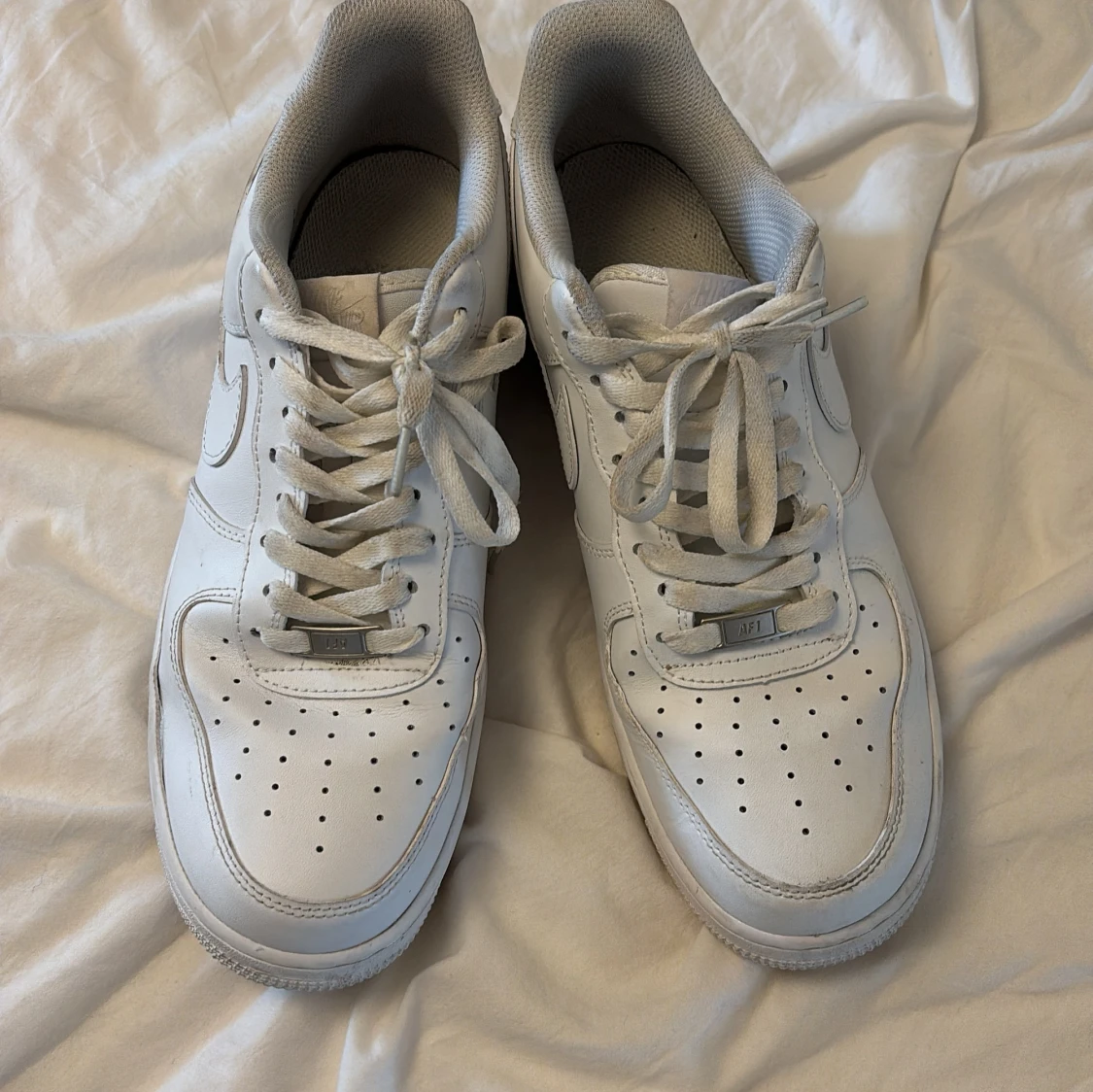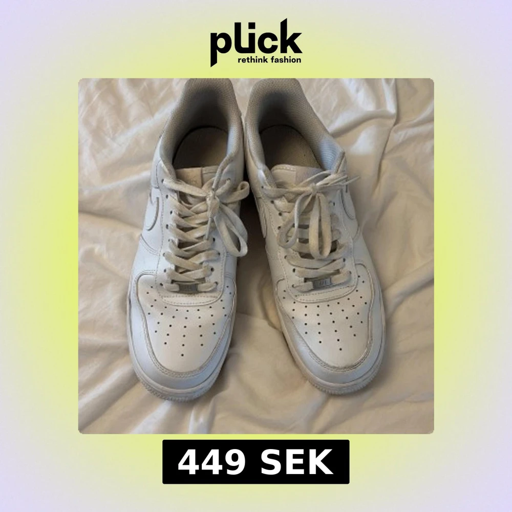 Klassiska Nike Air Force 1 sneakers i helvitt skinn med perforerad tå och vit sula. Skorna har rund tå, snörning och diskret Nike-logga på sidan. Perfekta för en clean och tidlös streetstil.