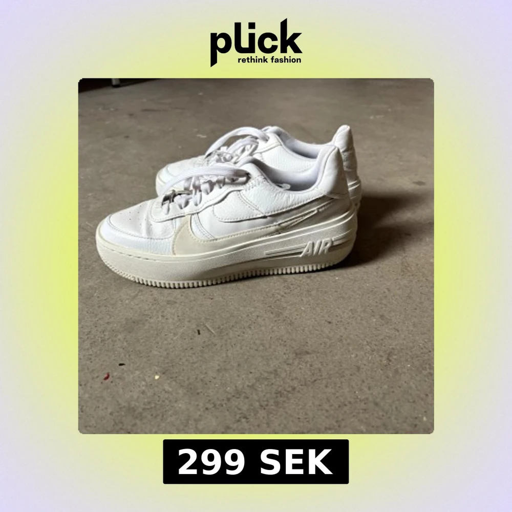 Fräscha Nike Air Force 1 sneakers i helvitt skinn med klassisk siluett och chunky platt sula. Snygga detaljer som perforerad tå, silverfärgad AF1-detalj på snörningen och ikonisk swoosh på sidan. Perfekta för en clean och stilren look. Detta är en annan modell än de klassika, köpta på zalando så äkta givetvis! Små defekter så som att metallabrickan rostat lote o ändarna av snörena är sönder men snören går att ersätta hur lätt som helst. Nypris 1200kr