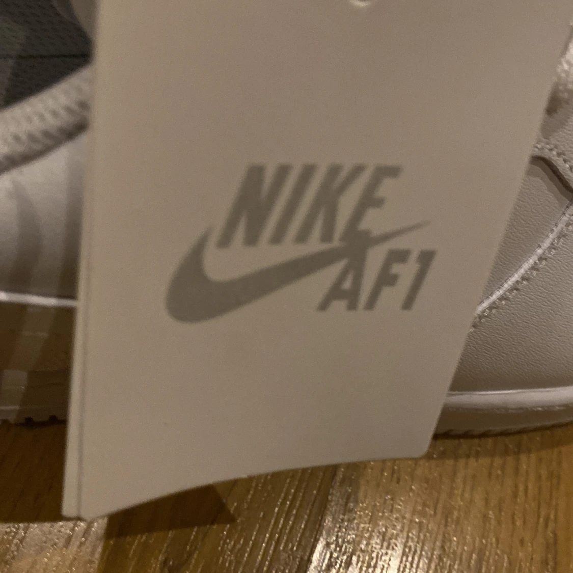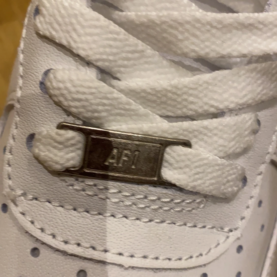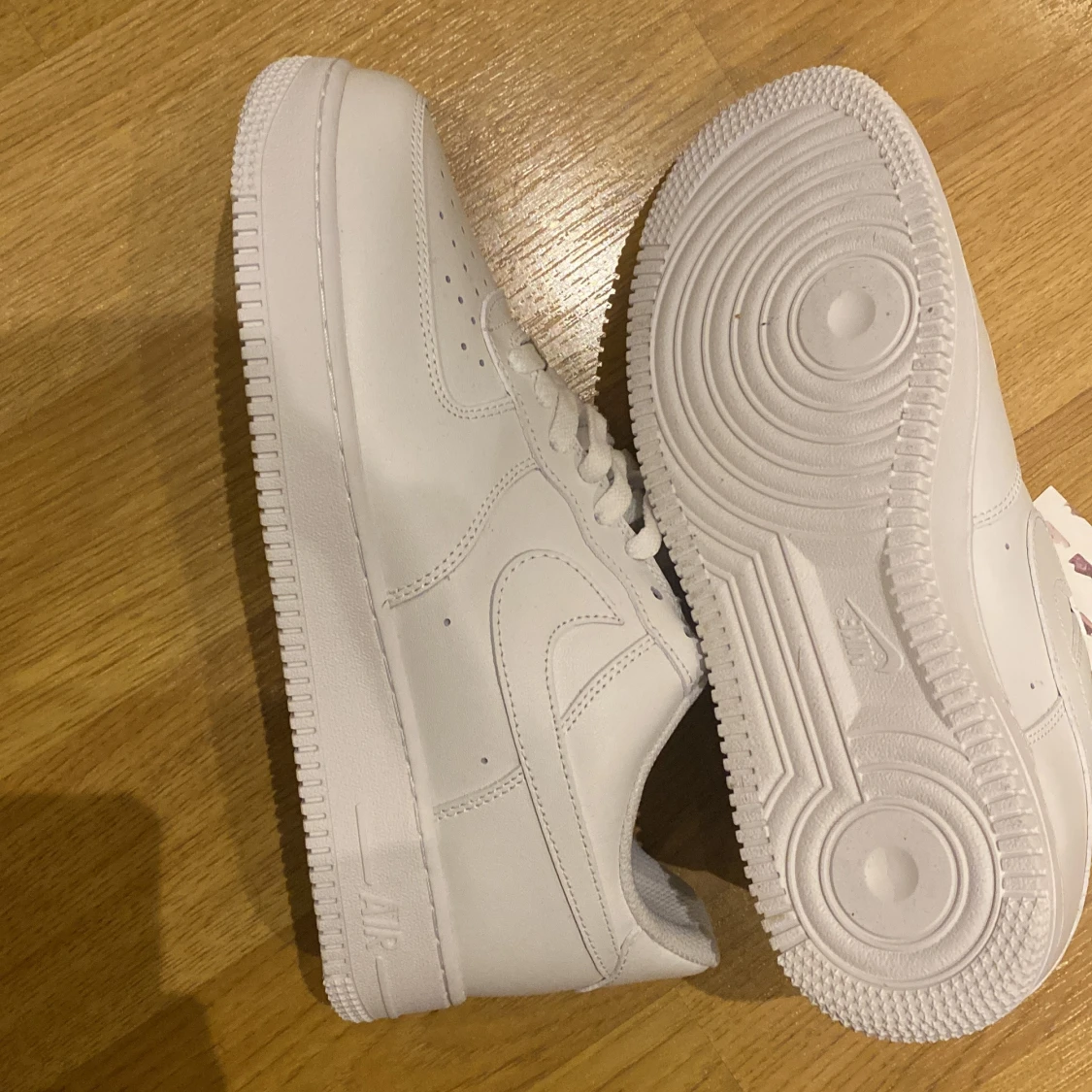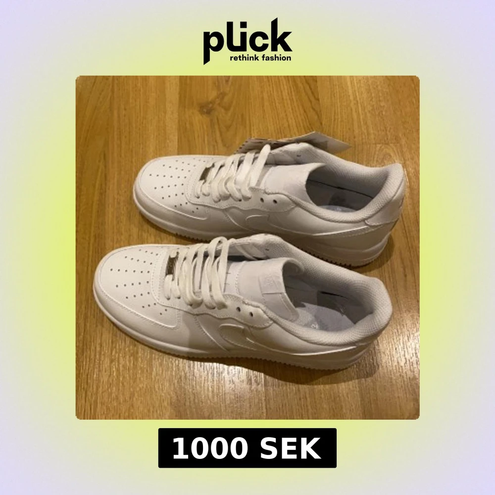 Fräscha och klassiska Nike Air Force 1 sneakers i helvitt skinn med perforerad tå och platt sula. Snygga detaljer som metallbricka med 'AF1' på snörningen och ikonisk swoosh på sidan. Perfekt för dig som gillar stilrena och tidlösa sneakers. Anledning till varför jag säljer dem är för att dem är för stora.