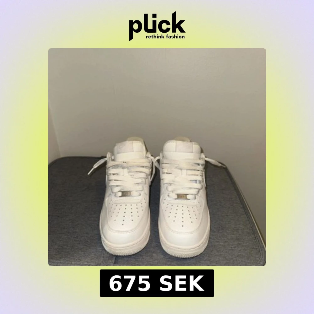 Klassiska Nike Air Force 1 sneakers i helvitt skinn med rund tå och platt sula. Skorna har perforerade detaljer på tån, snörning och den ikoniska swoosh-loggan på sidorna. Perfekta för en clean och stilren look.
