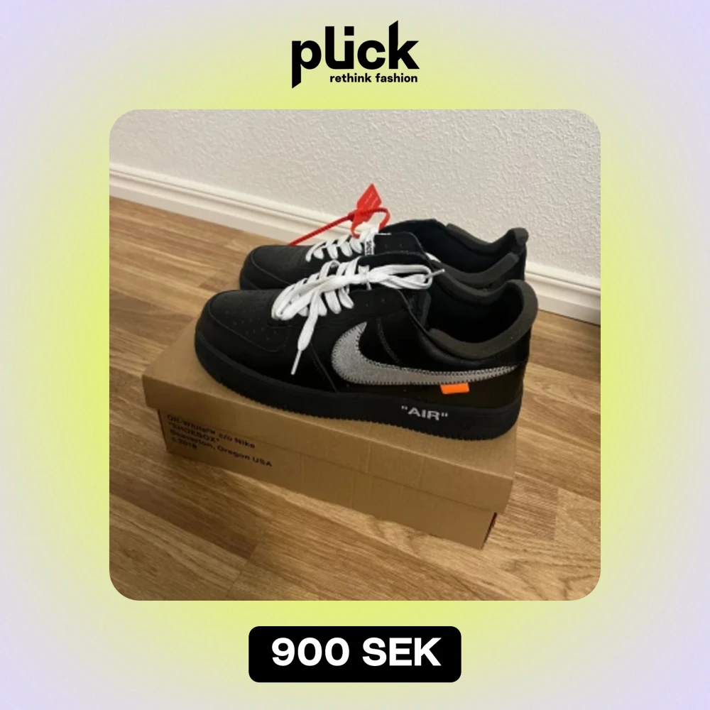 Nike Air Force 1 x Off White skor, aldrig använda, endast testade (OBS: Dessa är replikor) en liten bit på ”gummit” runt skorn har gått av som synes på sista bilden men den lilla biten medföljer så går att limma fast eller annat. Strl: 44/44,5