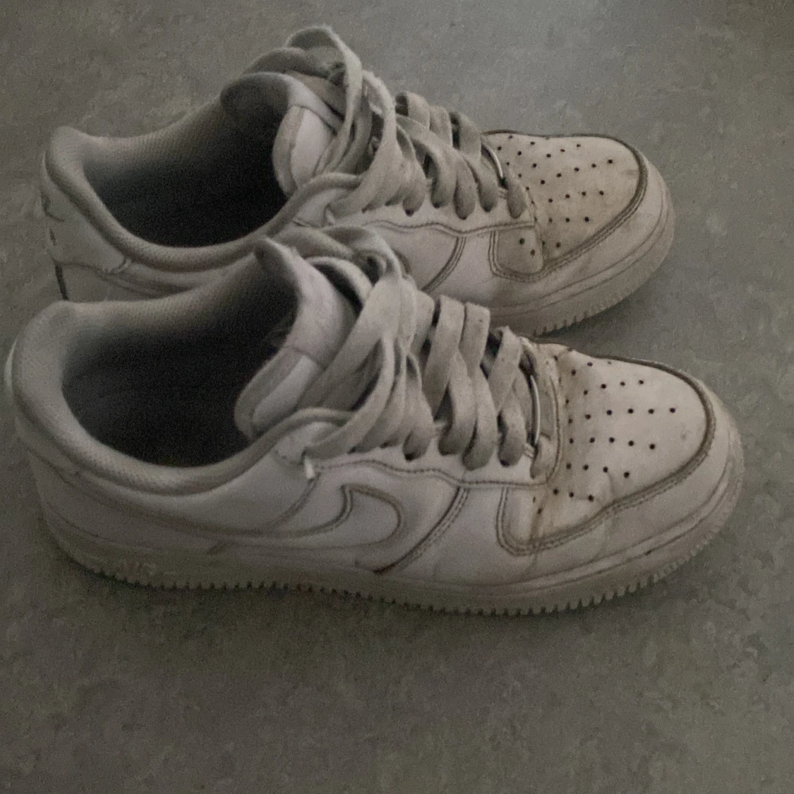 Säljer ett par vita sneakers med snörning. Skorna har en klassisk design med perforerade detaljer på ovansidan för ventilation. Perfekta för en avslappnad stil.