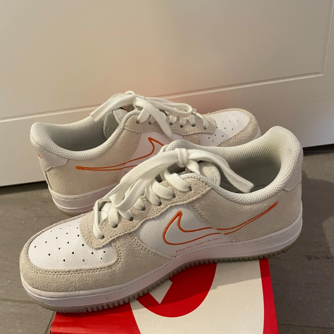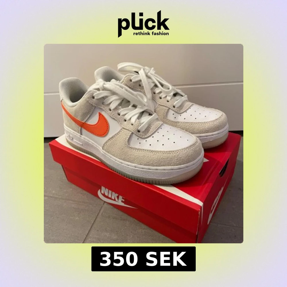Snygga Nike Air Force sneakers i vitt och beige med orangea detaljer. Använt ett fåtal gånger. Någon fläck kan förekomma, går lätt att tvätta bort. Storlek 38
