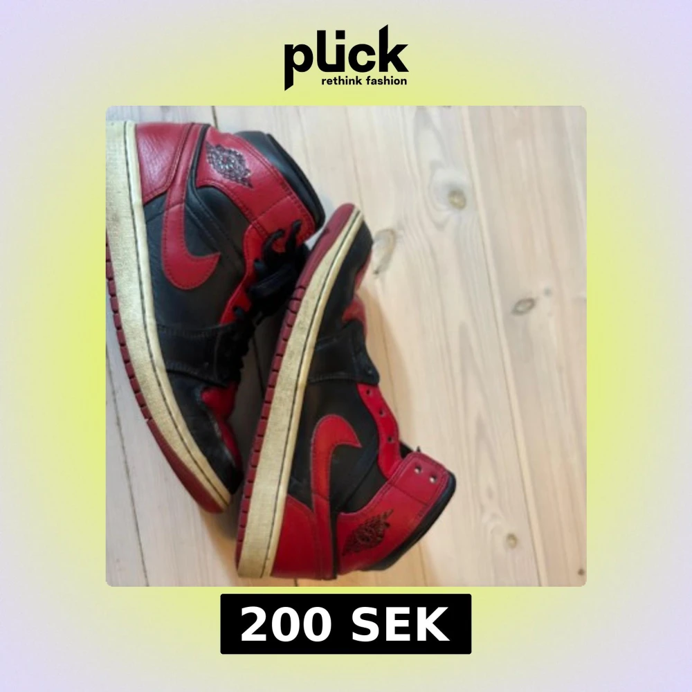 Säljer ett par klassiska Nike Air Jordan 1 Highs i svart och rött skinn. Ikonisk vinge-logga på sidan och röd swoosh. Hög modell med snörning och vintage-inspirerad sula. Perfekta för dig som vill sticka ut med en tidlös sneaker.
