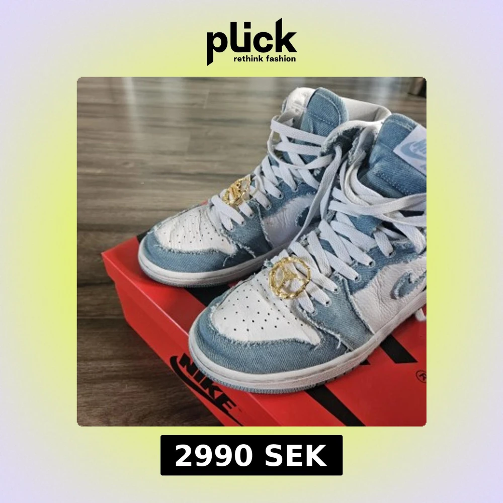 Unika Nike Air Jordan 1 Highs med ljusblå denim och vitt skinn. Råa kanter på jeanstyget ger en cool, sliten look. Skorna har vita snören, perforerad tå och guldiga Jordan-detaljer på snörningen. Perfekta för dig som vill sticka ut med streetstyle. Bara lite slitna, använda 2 gånger. Köpta på Nike snkr, återförsäljare som "Wear the talk" säljer dem för 4880 idag