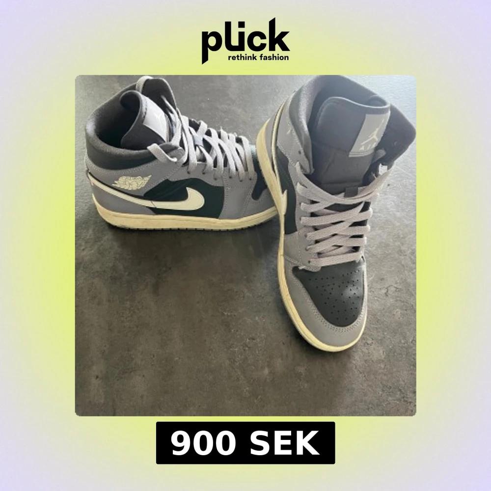 Snygga Nike Air Jordan 1 sneakers i grått och svart med vita detaljer och klassisk vinge-logga på sidan. Skorna har högt skaft, snörning och är tillverkade i skinn. Perfekta för dig som vill ha en ikonisk och streetig look.